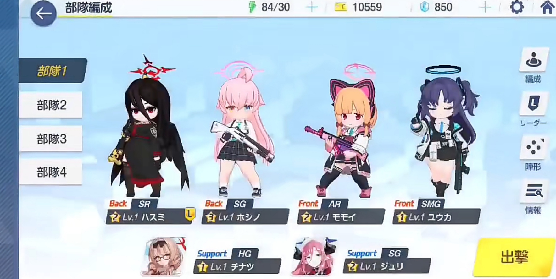 在蔚蓝档案的队伍里会一直解锁位子,到最后一共可以上场四个人作为场上的主要角色,旁边有两个后台场下位子可以先忽略不计,玩家搭配队伍位子是有技巧的,最好是是坦克放在最前排,中间放一两个输出高的后排,最后面放辅助型角色,因为这种角色一般身板脆,非常需要队友抗伤害,这样合理的阵容既有生存力输出又高。