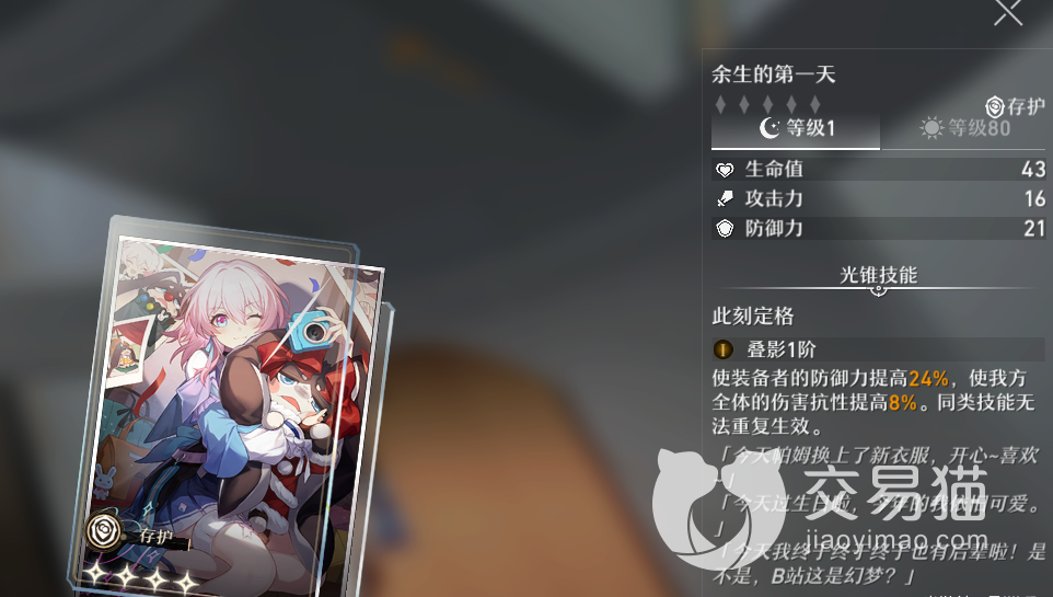 第二个光锥推荐【余生的一天】4星光锥:主要效果是让装备者提高24%的防御力,而且提高友方全体伤害抗性8%,是一个不错的团队型光锥,但是同类技能是无法重复生效的哦,如果队伍有这类技能可以直接略过啦!