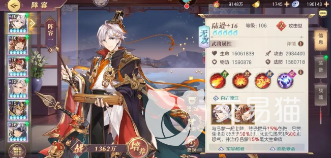 5、陆逊:他拥有很高的法术伤害,主要的输出方法就是灼烧,以及引爆灼烧。他在游戏中的定位是谋士,主要使用的是法术攻击。