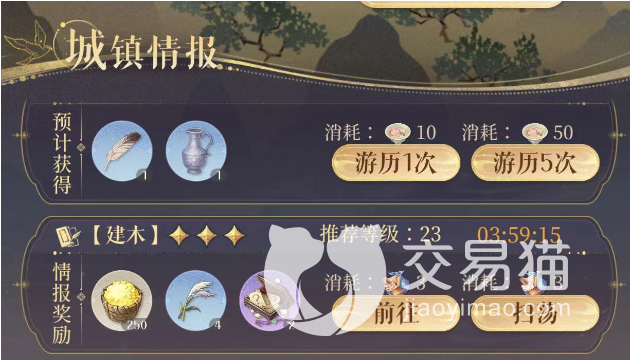 2、城镇情报,每当收集据点资源时,会刷新出不同星级的城镇情报,每个情报消耗对应数量的行囊就可以完成一次,不同星级获取的栗米数量也是不等,不过星级高的情报收获还是很可观的。