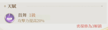 鼓舞:修为3解锁的一个天赋技能,一级就能提升自己20%的攻击力,对于攻击稍显不足的甘缇来说,起到了很大的帮助,能够使其在利用单一的普攻进行输出时不再那么乏力。