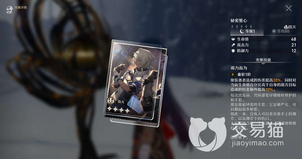 实在是拿不到的朋友,其实游戏里面也是有着对应的替代光锥给大家去使用的,其中以四星秘密誓心比较受欢迎,同样的是提高伤害,同时对于生命值百分之高于自身的伤害还会额外增加,虽然是在伤害方面提升了,不过续航这个短板并没有得到很好的补充,所以它作为过渡使用还是非常不错的。
