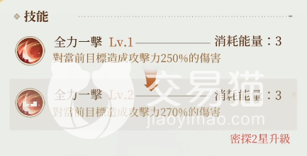 全力一击:同样是与严颜同名同效果的一个技能,250%的伤害倍率也算是蓝卡中的翘楚了,不过它的能量消耗较高,而且目标范围也较小,只适用于前期过渡阶段使用。
