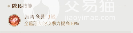 鼓舞全员:初始效果是令全体队友的攻击力提升10%,这个增益的幅度还算不错,重点是它能够对全体队友生效,生效之后队伍的整体输出都会提升不少,前期输出缺少的情况下,想加快推图速度,那么可以直接将蛾使作为队长出战,之后激活了这个技能,整体的清图效率都会提高不少。