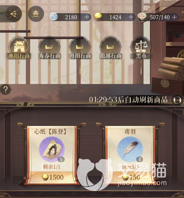 还有要注意的是每个行商的道具商店里的物品各有特点,有的可以消费1500栗米兑换紫色卡牌的心纸,对应角色的心纸是角色升星时的必要物品哦,另外还可以通过粟米购买其它比较重要的资源或物品包括:密探突破道具、特定的材料、升级据点资源管道局、粮草、专属道具以及密探突破信赖等级的金锁等等。