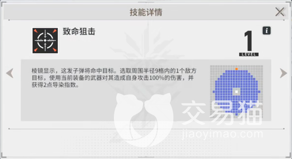我们再来看看技能方面,主动技能致命狙击能够给9格范围内的一个单体敌人造成100%攻击力的伤害,并且获取2层的导染指数。这个导染是其他技能释放所需要消耗的。在提升等级之后不仅是可以提升伤害,也能够增加获取导染的数量。
