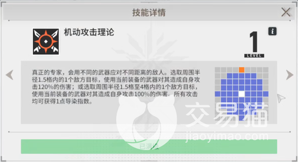主动技能机动攻击理论可以对周围1.5格内的单体敌人造成攻击力120%的伤害(近战),也能够攻击1.5-4格范围内的单体敌人(远程),并且造成100%的伤害。也就是说这个技能会根据敌人距离自动进行切换,打出对应的输出数值。前期比较万金油的技能,离得远一点也可以打到,就是伤害稍微少了一些。近距离作战的伤害非常可观,配合上白刃不错的机动性在场面上能够配合其他远程角色集火击杀某个敌人。