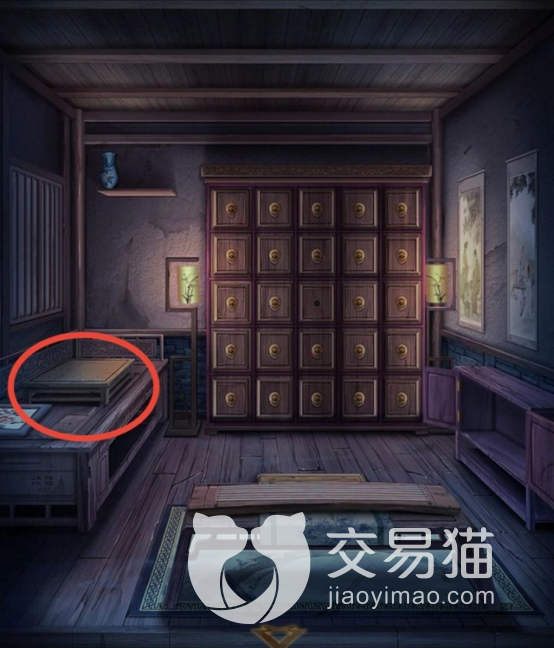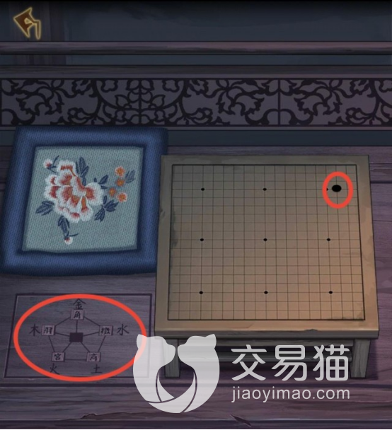 在这一关卡玩家需要分别进入到左右两个不同的房间里面,首先是在左边的厢房,各位玩家朋友需要首先点击床榻的左下角有文字的地方,发现一条“上为金木水火土,下是宫商角徵羽”的线索,其次去需要点击床榻上的棋盘,点击缺少的部分根据刚才发现的线索,打开机关获得“拉环”和“纸张”这两个道具。