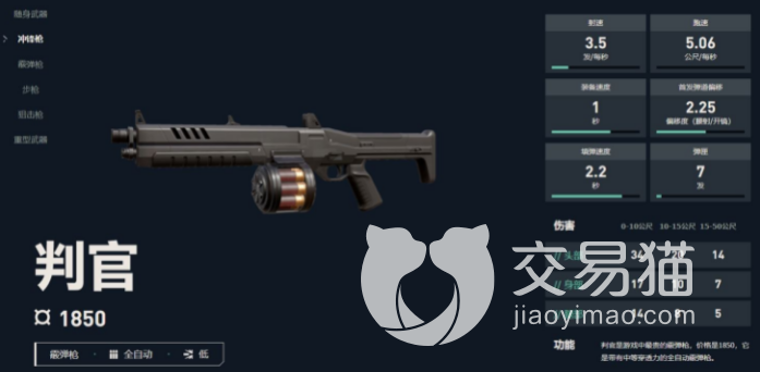 判官这把武器的价格为1850块,弹容容量为7发,备弹量为21发,具备全新的射击模式,主要攻击是全自动、低伤害,单颗子弹伤害,一发为12颗,具体命中即可要看与对方的距离。每秒1.1发,射速为每秒3.5发,移动速度为每秒5.06公尺,装备速度为一秒。具备很强的穿透能力,在游戏中较为优先。在这款硬核的游戏当中,这些枪械武器个个都很方便,判官这把枪是玩家的必备选择。