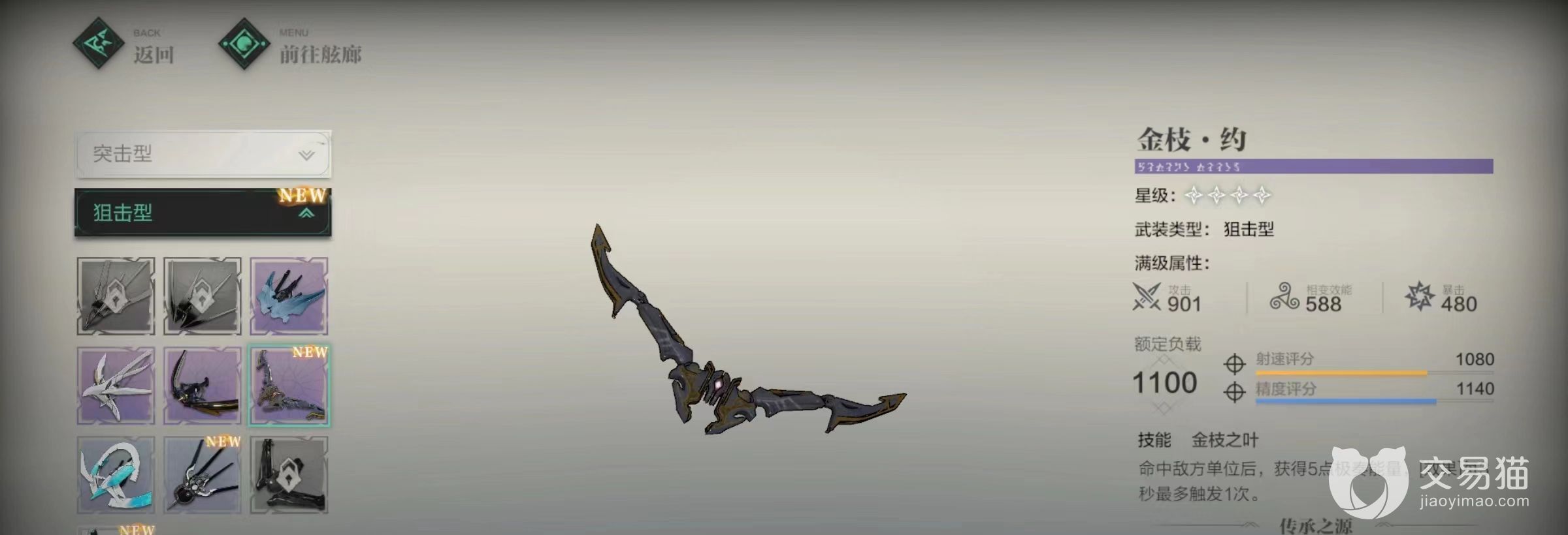 第二个给大家展示的是金枝·约。在战场上,这件武器能够极大地增加极奏技能的施放速度,其作用是击中敌人后,将会得到5点极奏能量加成,并且每3秒就能触发一次。尤其适合像归陌这样的极奏技能伤害爆炸的高输出职业。在释放了序曲技能之后,归陌的攻击速度会更快,也会更快的恢复自己的极奏能量,以此进入良性循环,更高频的用大招对敌人进行轰炸。