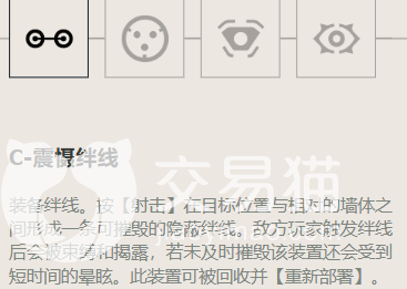 陷阱线:玩家可以在两面墙之间,放置一个潜行的陷阱线,只要触发此线的敌人就会受到限制,并且暴露在大众视野一段时间。如果此陷阱没有被人摧毁,将会自动激活,并且眩晕住在此范围之内的敌人,而陷阱线也可以直接被捡起。如果玩家对一些敌军比较感兴趣,可以尝试在敌军之间放陷阱线来收获成功。