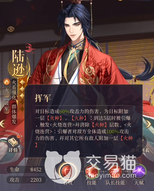 陆逊大招对敌方全体造成90%攻击力的伤害,放大招属于是一次伤害,所以可以额外加一层全体火种。叠火种的效率其实挺高,那么就需要其他火属性的队友提高火伤。