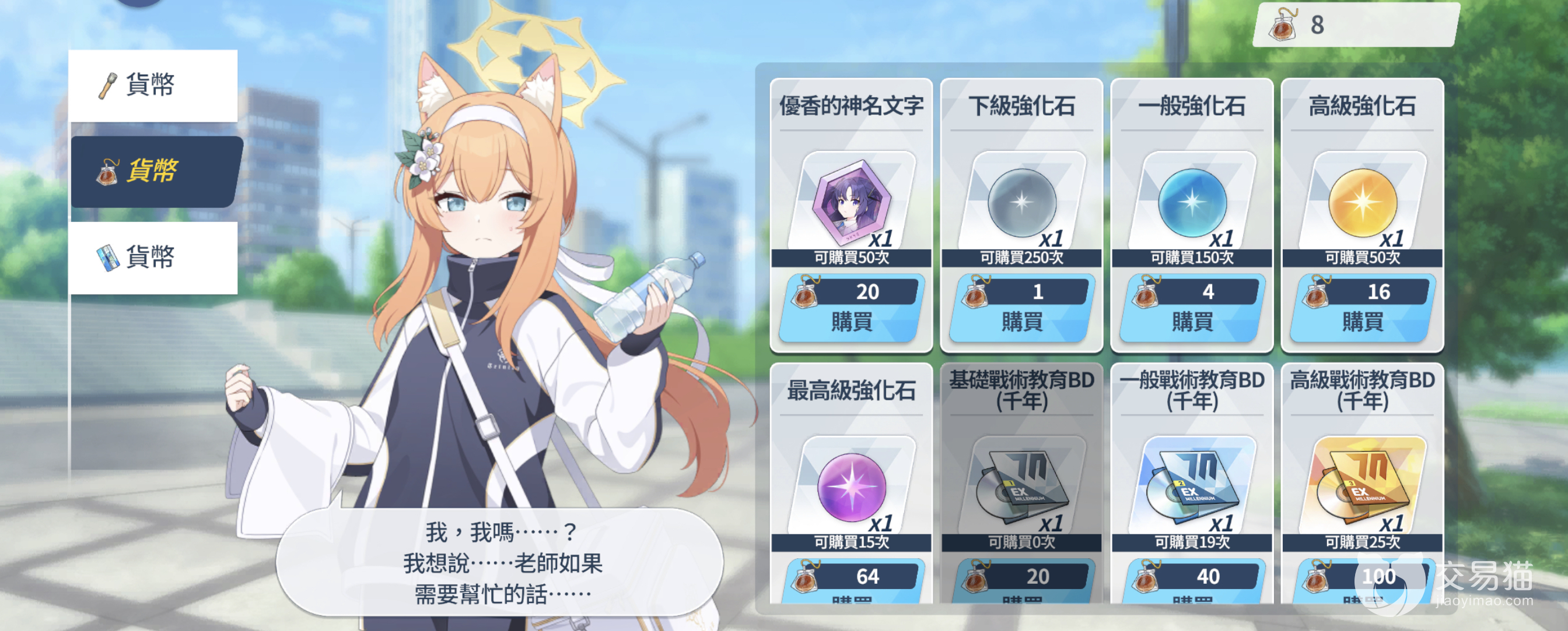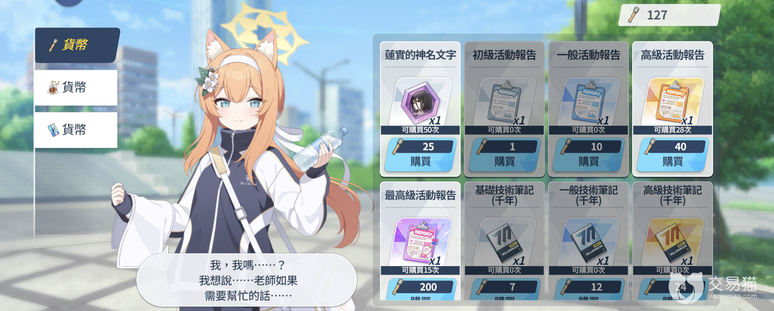 接着是导览手册商店,在这里玩家们能够换取的道具有羽留奈神名文字碎片、四种品类的礼物以及四种等级的温尼珀索基石头和羅洪特抄本,羽留奈神名文字可以兑换的数量足足有五十个,对于新手期的玩家们来说,羽留奈是非常强力的角色,甚至到后期都大有可用之处。礼物可以用来提升于学生之间的羁绊值,最后的两种道具则是用于学生技能的升级,是玩家们平时比较难获取的资源。清空导览手册商店需要用到12700个导览手册,预计消耗的体力是2772点,是最推荐玩家们进行兑换的商店。