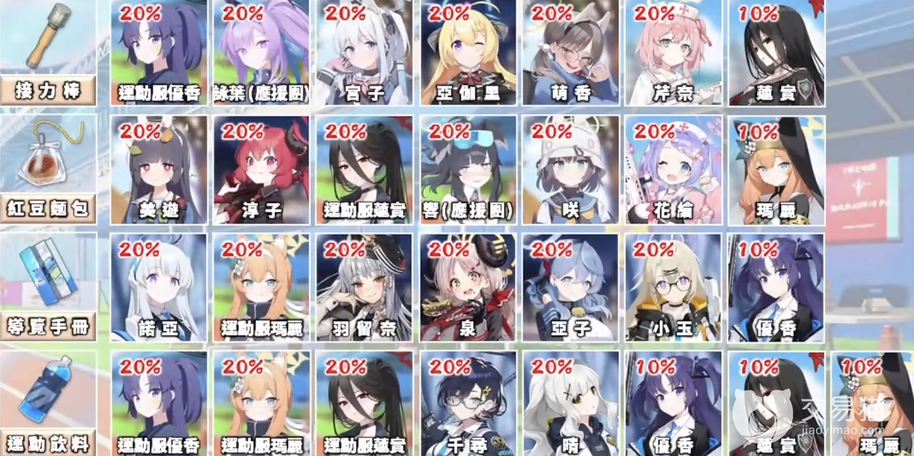 玩家们在扫荡活动关卡时,也可以使用能够带来物品获得加成的学生,例如在能刷出接力棒代币的关卡中,玩家们选择在队伍中配置体育服优香、咏叶应援团、都子、亚都梨等等学生,能够大大提高接力棒的爆率,而红豆面包代币关卡中,淳子、运动服莲实、玛丽和花绘等这些学生,能够给玩家们扫荡结束后带来更多的红豆面包。小编在这里放出一张对照表,方便玩家们在不同关卡中配置学生。玩家们在活动期间也通过购买体力扫荡关卡来搬空活动商店中的奖励。