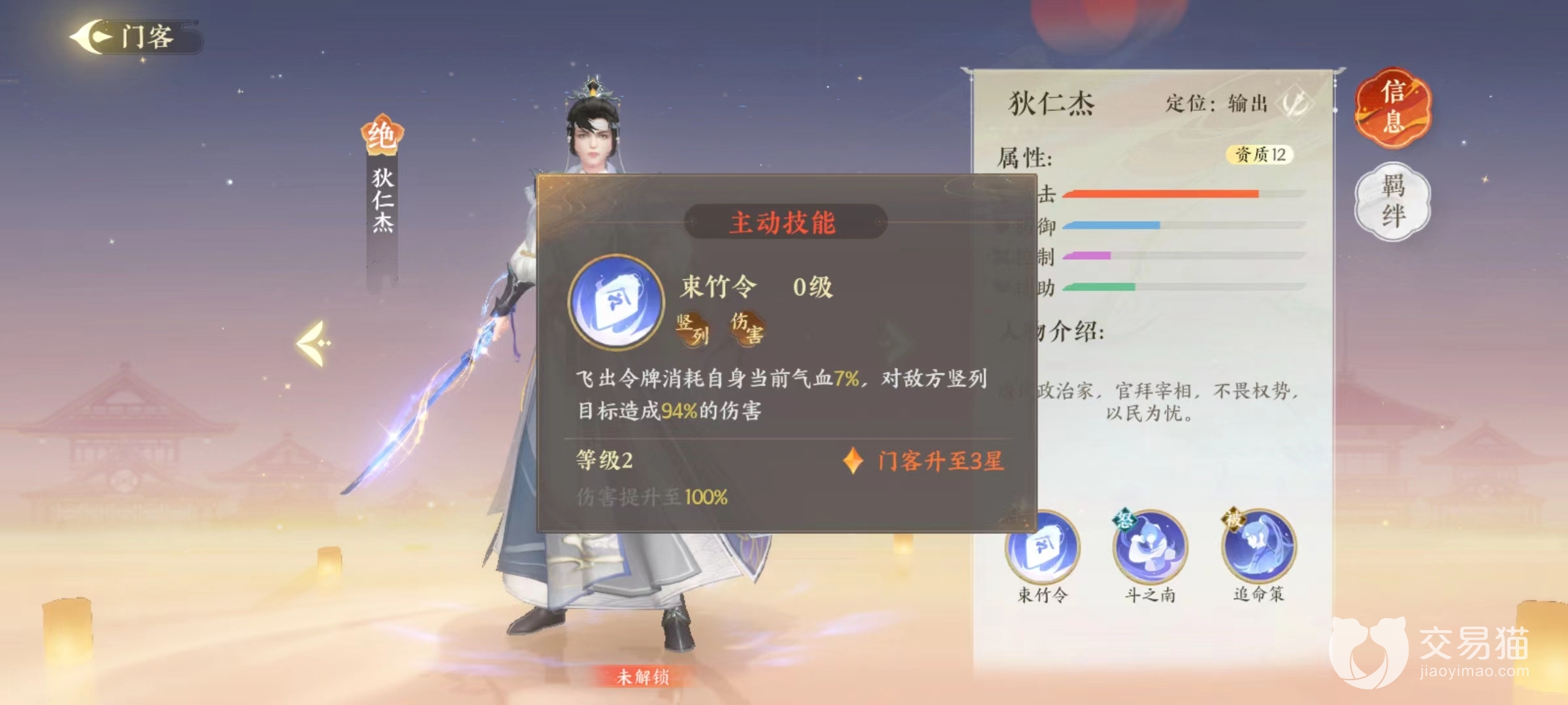 从属性方面来看,资质12点,攻击力非常突出,缺点是控制和辅助效果极差。主要技能为将手中的令牌扔出去,消耗自身当前少部分血量,对敌方竖列所有目标造成伤害,当升到三星时,伤害比例提升至100%。以自身血量为代价换来的伤害虽然可观,但是存在一定程度缺陷,但对于狄仁杰来说,因为有被动追命策的存在,所以甚至可以成为优势。