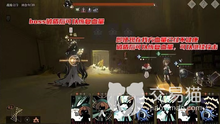 明白了这些之后,思路就非常清晰,因为反击直接利用缴械就能挡掉,所以搭配阵容时可以带有一些能缴械角色。狂暴核心输出依然必不可少,要想通关只有快速击飞护盾,在眩晕一回合里可以集中所有火力打掉boss相当多的血量。如果不能及时破盾,高额伤害反击会将我方直接拖垮。开战之后第1场属于小怪战斗,第2场才是和boss对战。打boss时思路除了尽快破盾之外,尽量不要让同一名角色在回合内输出次数过多,因为很容易被反击打掉。