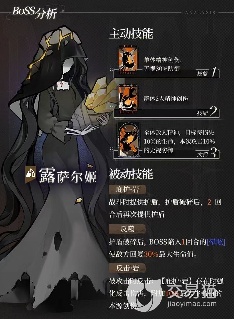 该boss第1个主动技能属于单体精神伤害,但无视30%防御使其技能看起来伤害较高。第2个主动是群体输出两人,第3个是全体伤害,根据目标损失生命值附加无视防御效果,生命值越低,无视防御比例也就越高,所以残血目标很容易被直接秒杀。被动技能依然是自身利用护盾去强化反击,存在护盾时反击可以附加最大生命值10%额外创伤,另外打碎护盾后boss会直接进入一回合眩晕,我方则能恢复30%生命值。