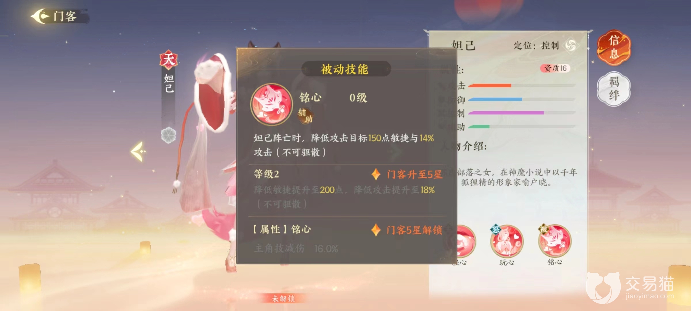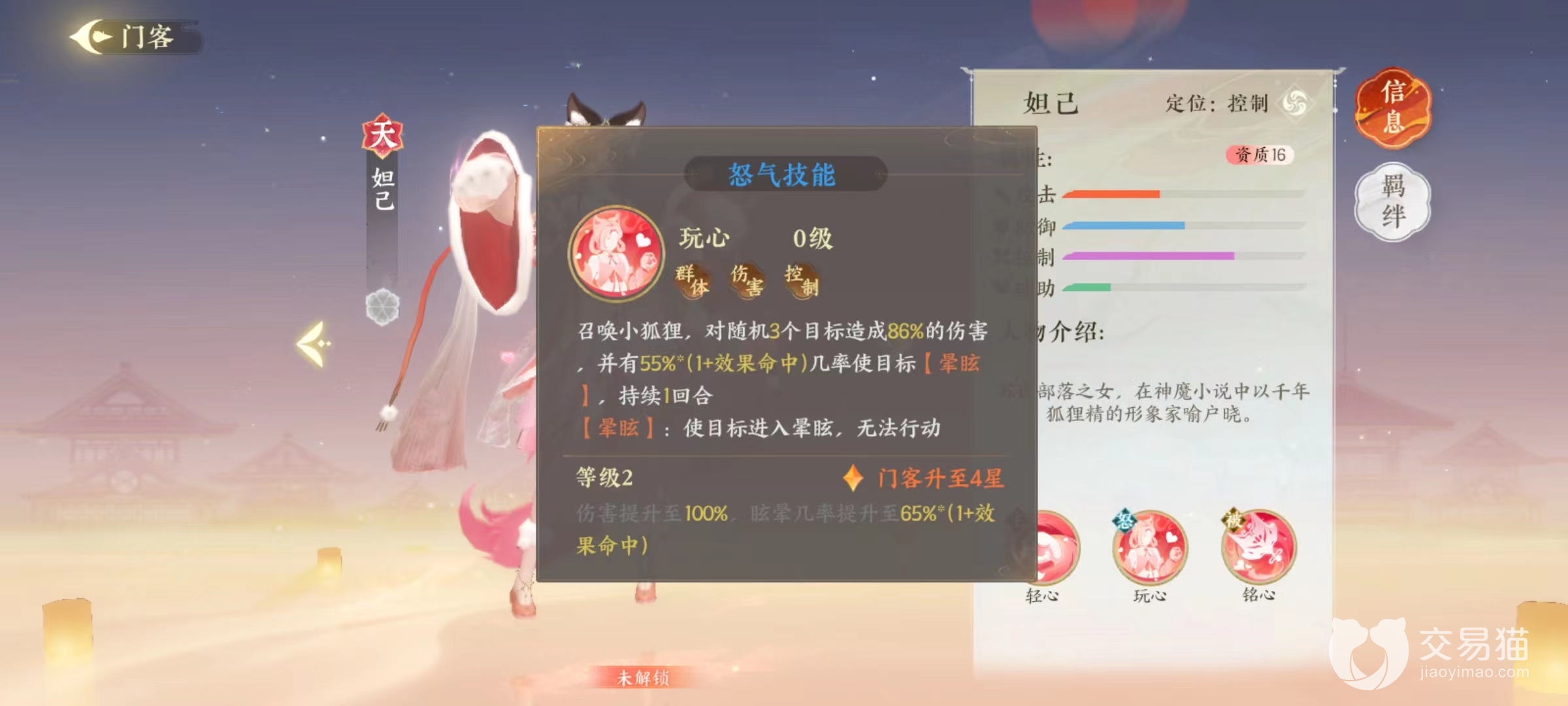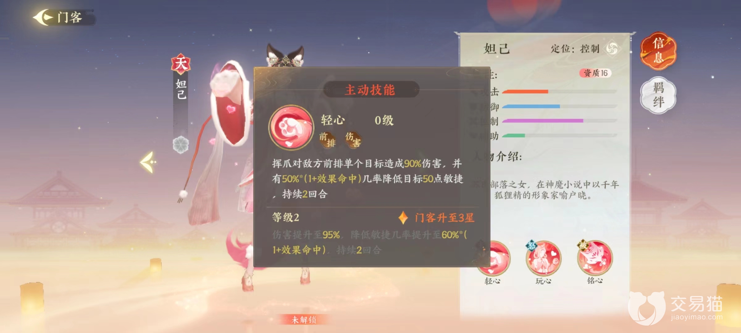 作为一名控制角色,妲己为16点资质,控制条虽然没有拉满,但是在所有角色中已经属于比较出色的一个。主动技能为选择敌方前排单个目标输出,同时有一定几率降低其50点敏捷,能持续两个回合。当达到三星时,除了伤害提升之外,降低敏捷几率也会相应提高,受到效果命中加成影响,如果命中加成足够高,甚至可以达到100%必定会削弱。