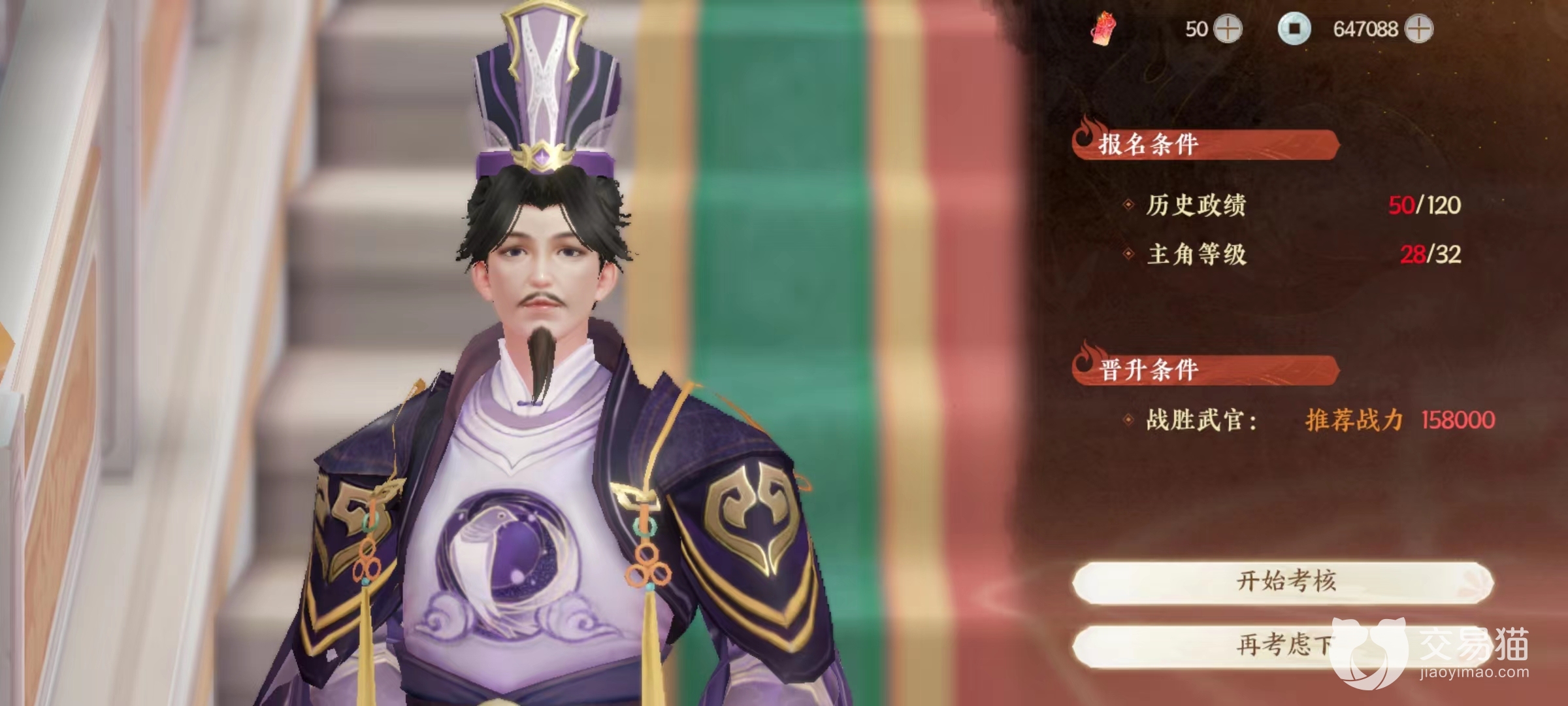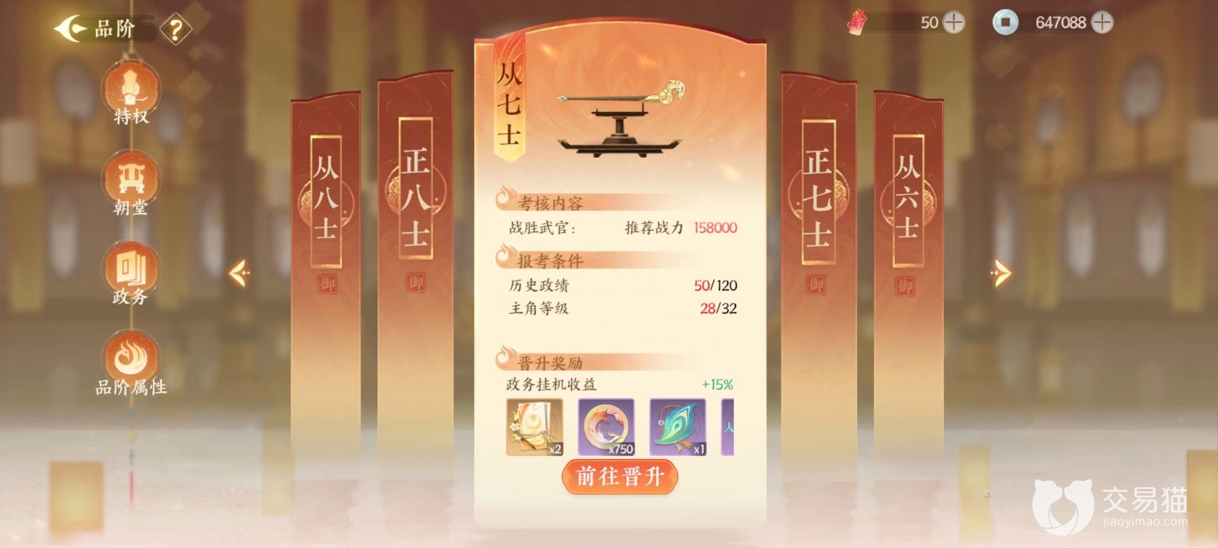 在主页面中打开扩展功能按键,右方就可以看到有晋升图标,点击之后首先查看到的是当前所能晋升的下一品阶。品阶开始于从九士,一直到最后的正一士,也就对应古代中的九品中正制。晋升时候存在时间限制以及报名条件,主要包括需要达到指定等级,历史政绩和世家影响等,在当前都有对应考核内容。只要查看一下达到要求,就可以点击下方的前往晋升,去参加考试,合格之后直接由皇帝下旨达到新品阶。