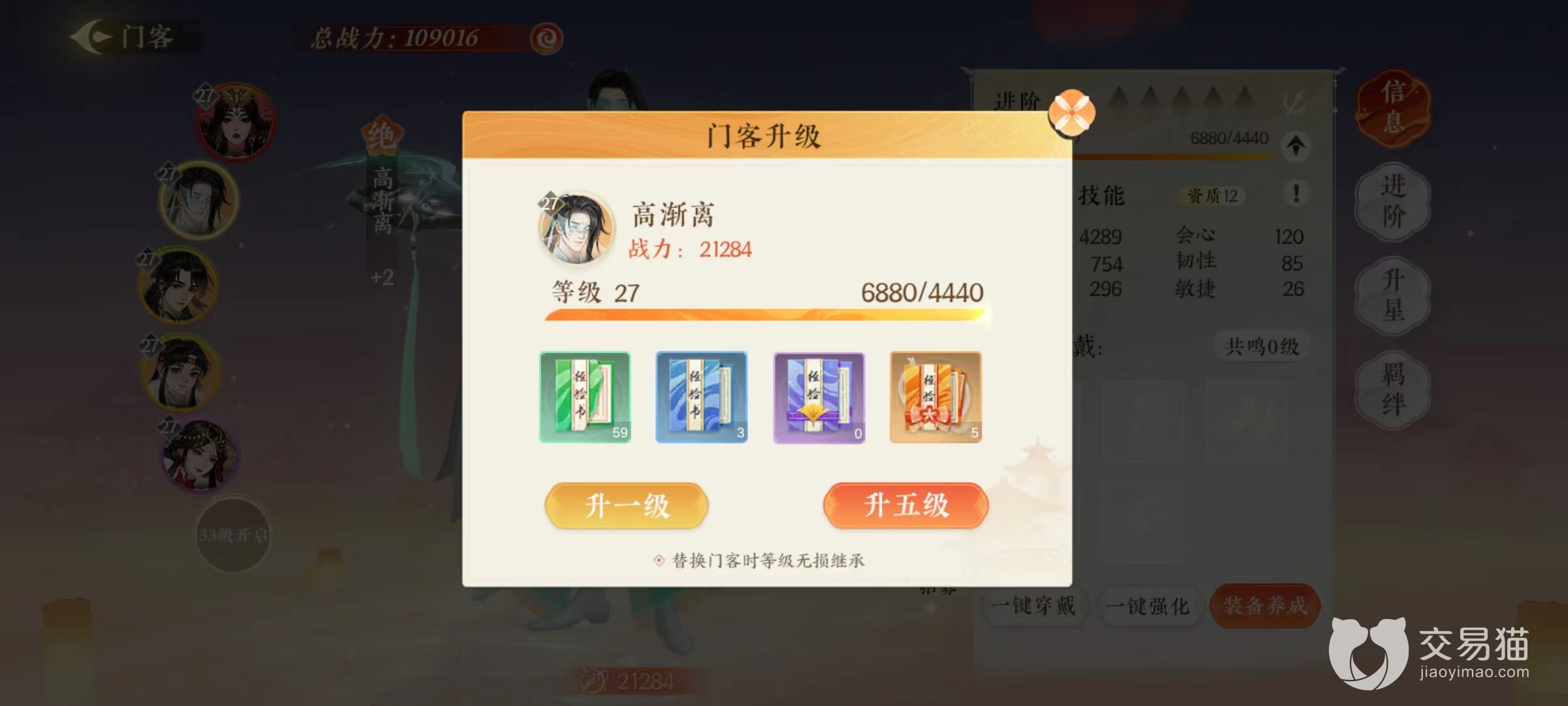 获得门客之后,无论是输出、防御或是辅助属性,接下来要进行的养成都是一样的。首先是提高等级,这里有一点要介绍,那就是等级将会被后来所更换角色所继承,也就意味着前期能够放心升级,即使更换也没有任何损失,是最优先提升的养成方面。升级消耗的各种经验书,在前期活动中会大量获得,所以不用担心道具问题。