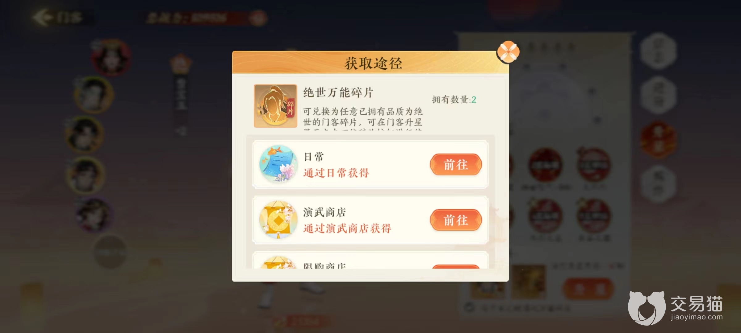 而后面要进行的升星则比较困难,因为要消耗同名碎片或者是万能碎片,如果要提升的是红色天品门客,消耗的就是天赐万能碎片,绝品就是绝世万能碎片。本来能够抽取到角色就已经很困难,碎片更是需要长期积累,主要获取途径除了继续招募之外,完成相应门客传记或是在藏宝洞等活动,都有机会获得。当然不可能全部角色一起提升,一定要找到最核心的人物,最关键就是输出要重点培养强化。
