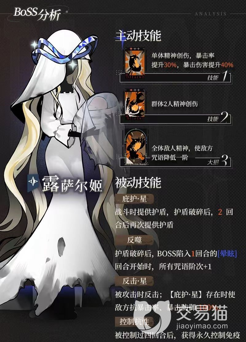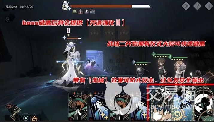 被动效果为战斗时生成护盾被打碎之后,两回合再次重新生成,护盾破碎后回合将使boss陷入到眩晕状态,所有身上咒语等级加1。一旦被攻击就能触发反击,当护盾存在时被反击目标抗暴击率,暴击防御等都将大幅削减,如果持续控制boss达到4个回合,接下来将会免疫,无法继续控制。明白了这些效果之后就可以进行实战演练,关卡分为两场战斗,第1场和小怪战斗,第2场则是面对boss。