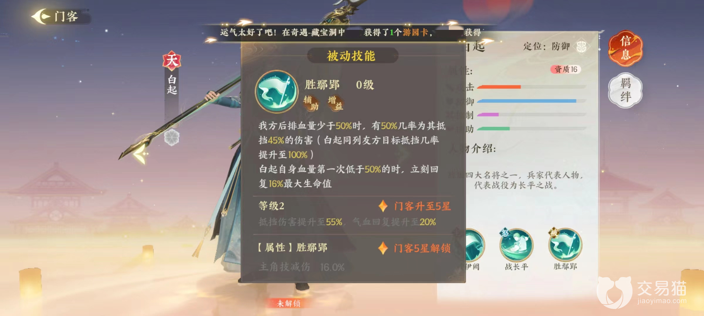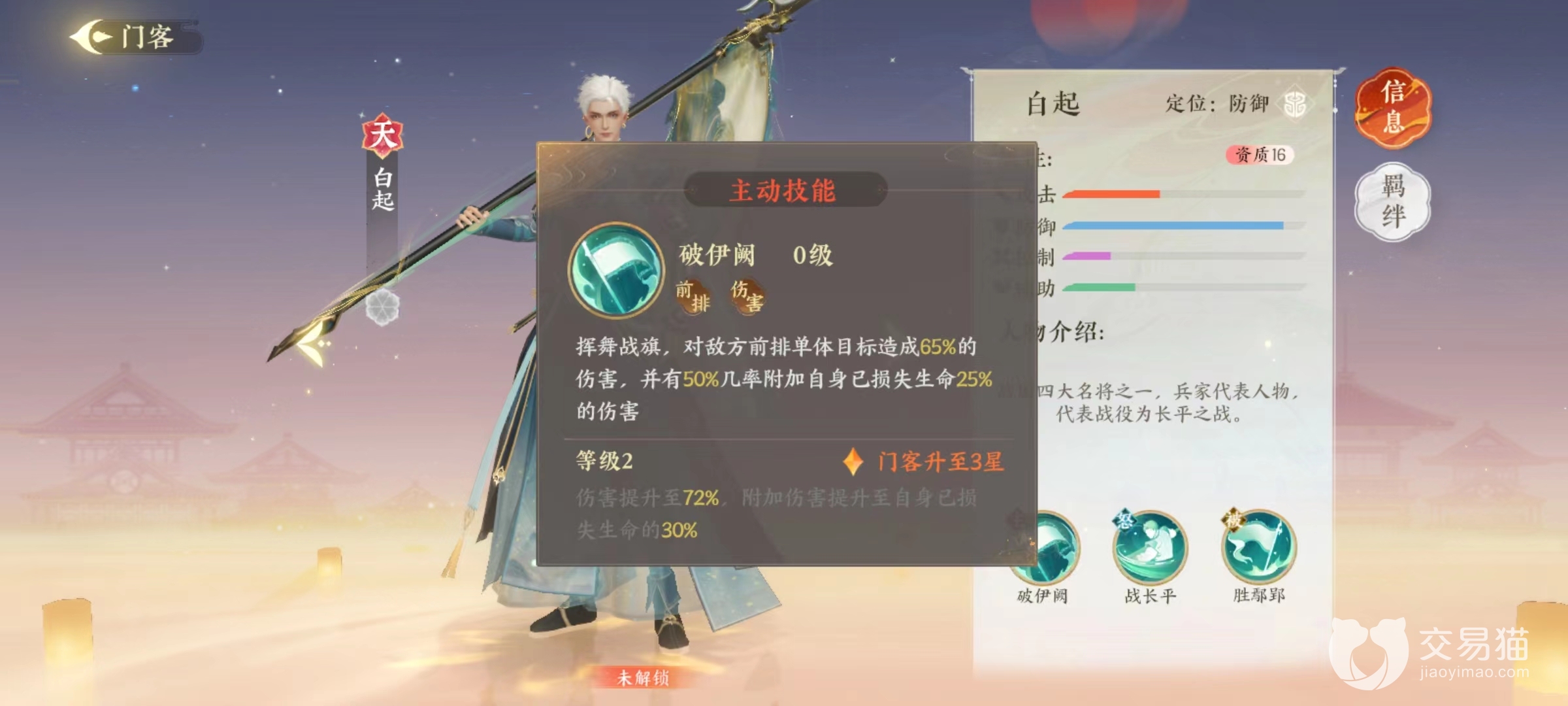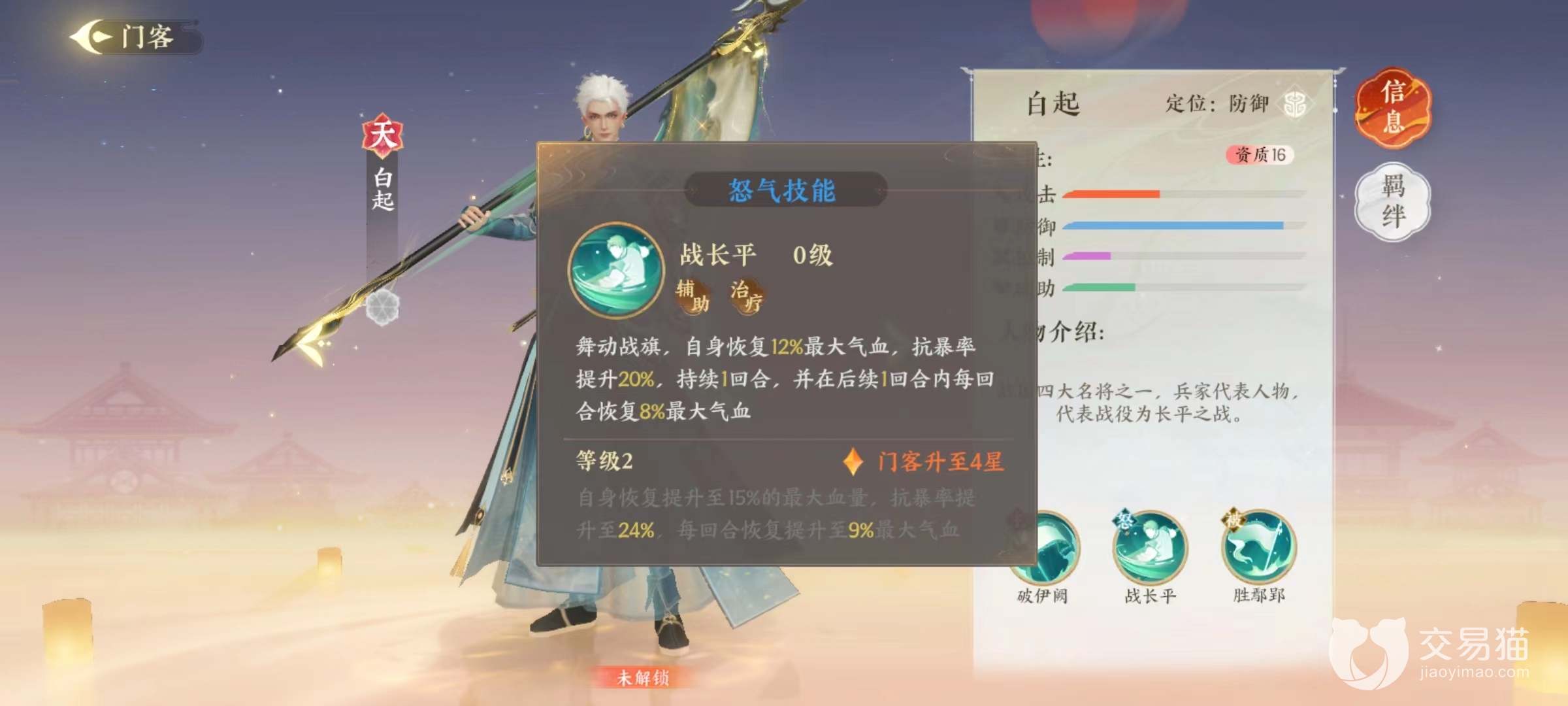 最后被动技能效果是当我方后排目标有角色血量低于半血时,白起会有几率为其抵挡部分伤害。如果该目标处于和白起同列位置,则抵挡几率提升至100%。最后是自身在本场战斗中血量首次低于半血时,立即恢复部分血量。这是用来保护队友的技能,后排有核心输出情况下,更是一定要放到白起后面,这样对方想要秒掉输出就会更加困难。