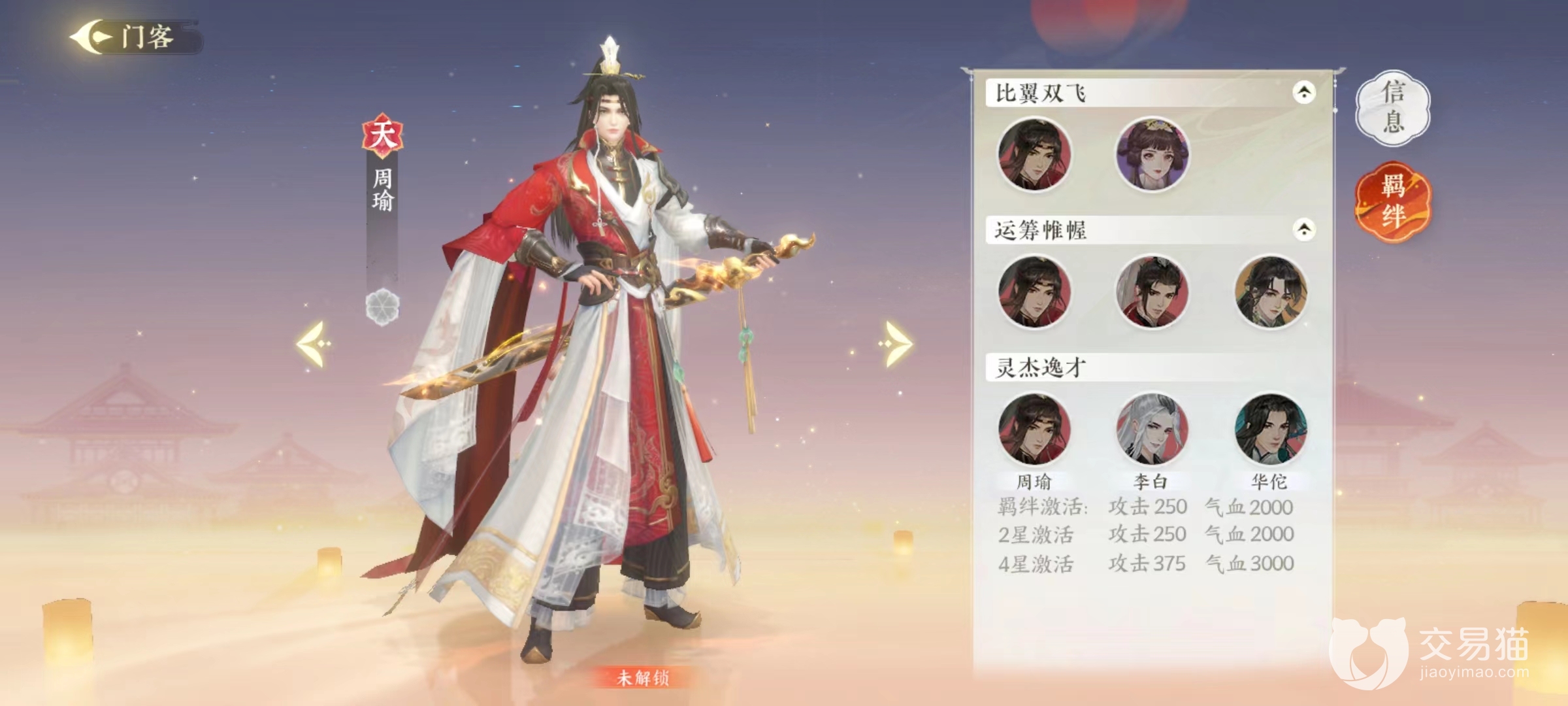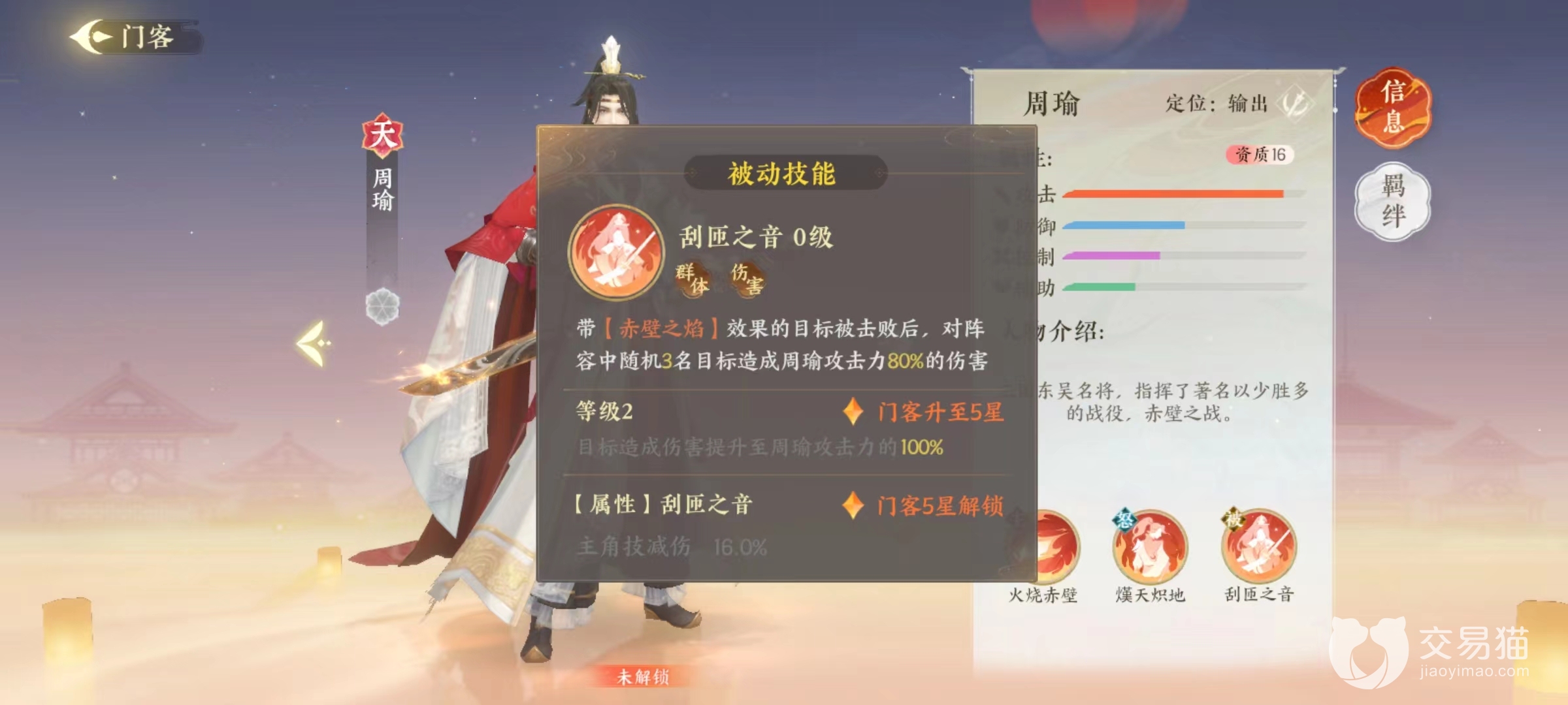被动状态是每当带有该状态的目标被击败时,周瑜都可以随机选择三名敌人,再次触发一次额外伤害,而且本次伤害以攻击力的80%为数值,达到5星时提升至100%。周瑜并不擅长斩杀,但是非常适合搭配单体输出极强的队友,这样只要队友能够将带有标记的目标击败,周瑜同样可以触发,这样整场战斗都有很出色表现。