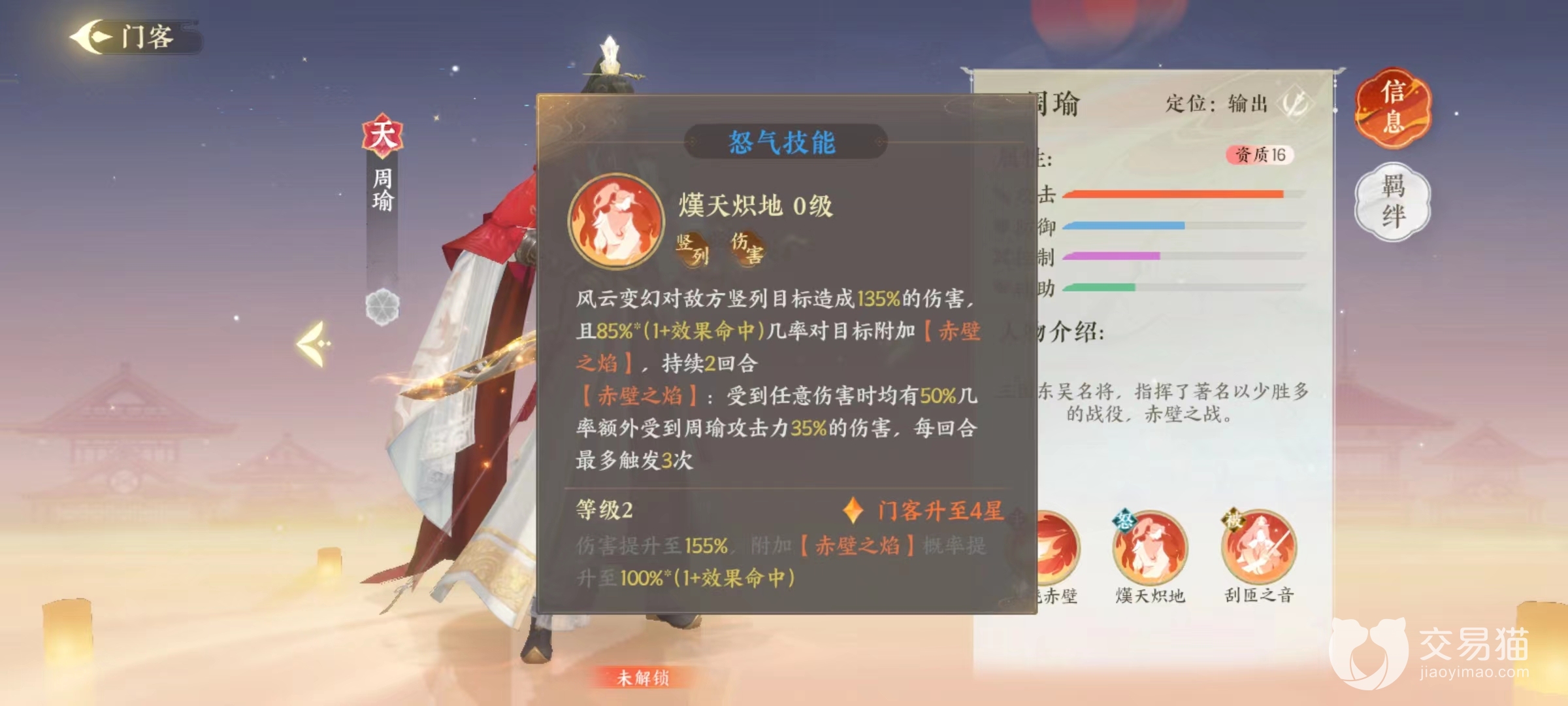 周瑜在历史中最知名的战绩就是赤壁之战,以火攻大胜曹操,所以在技能方面也少不了火焰帮助。主动技能火烧赤壁,召唤出大量火焰伤害对方竖列所有目标,同时还能附加赤壁之焰效果。该效果有着触发几率,受到效果命中影响,如果成功触发,对方将会在受到任意伤害时均能够有几率再次额外受到一次周瑜所附加的伤害,和周瑜自身攻击力相关,每回合最多附加三次。使用关键就是尽量触发的更多。
