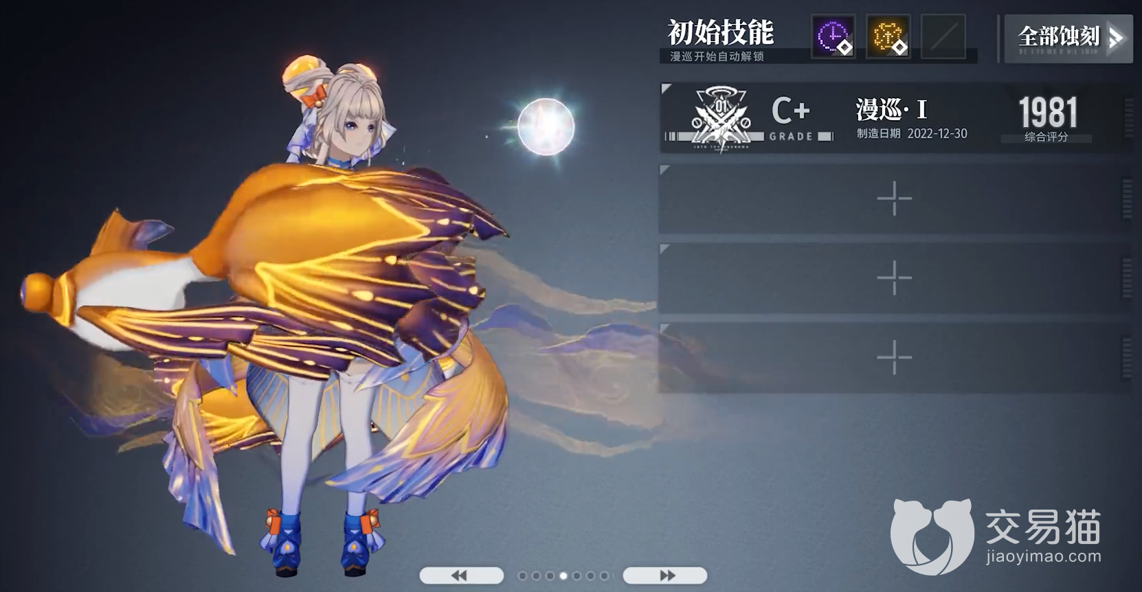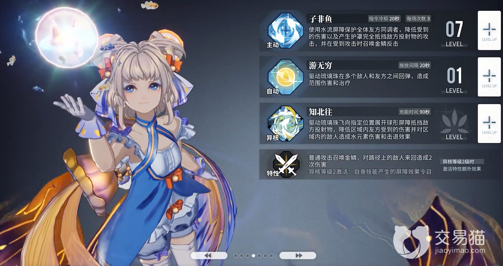 她的主动技能【子非鱼】在战斗中使用的时候可以制造出水属性的护盾保护全体队友,该护盾可以降低敌方的伤害,并且在该护盾消失的时候还可以召唤出金鱼进行一次反击伤害。自动技能【游无穷】在使用的时候可以使用琉璃珠在敌我双方进行反复回弹,在弹射到敌方单位的时候会造成伤害,弹射到友方单位时进行一定量的治疗回复效果。