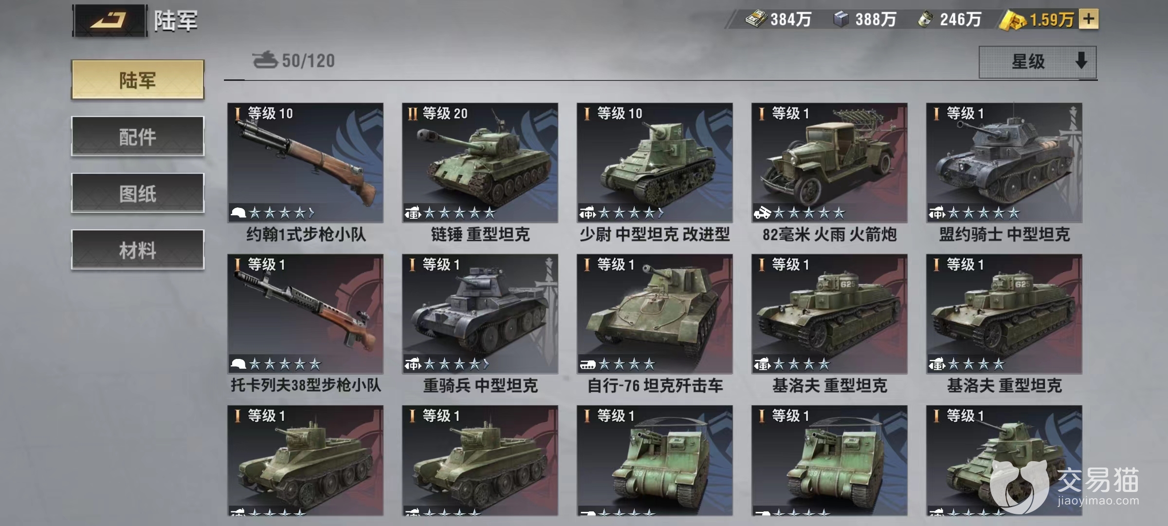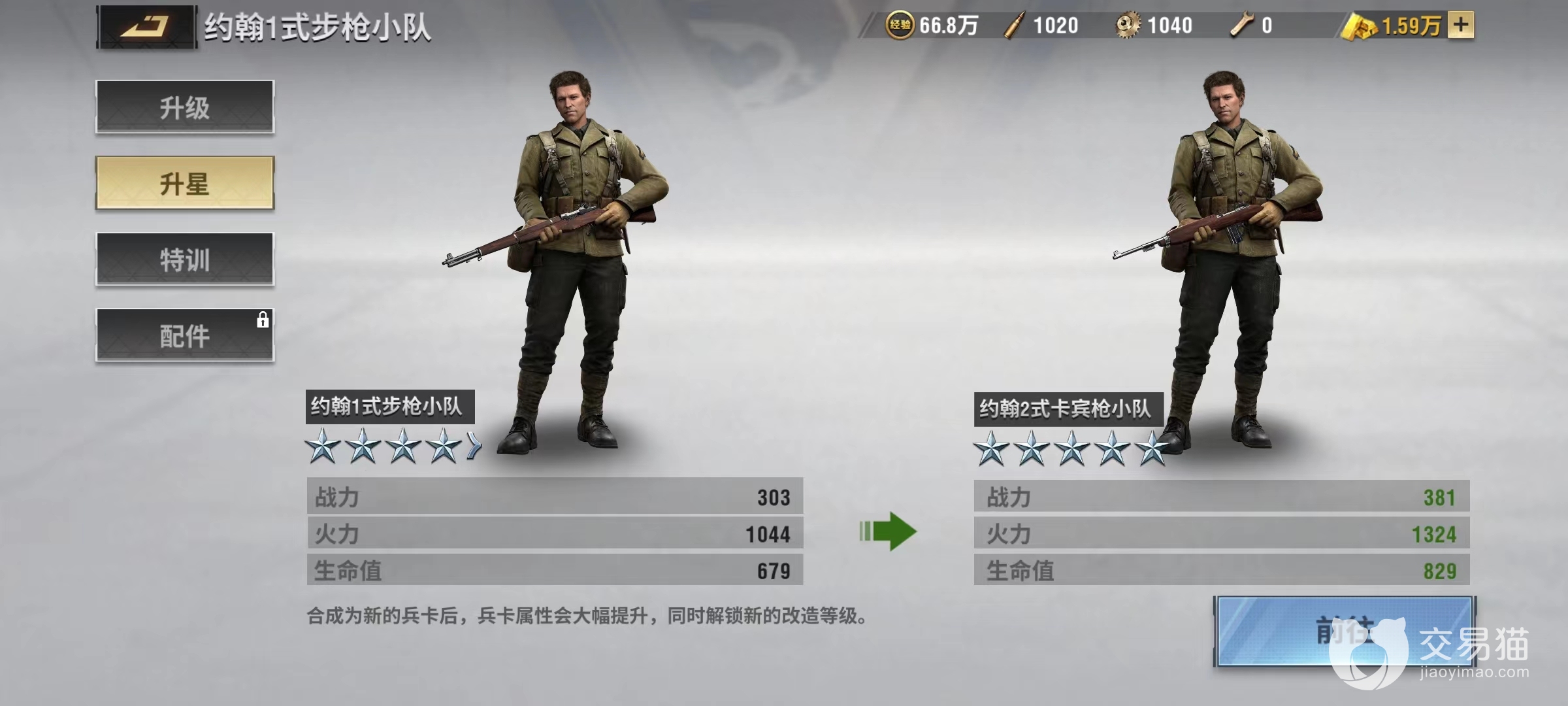 大家在主页面中打开兵卡选项,可以看到当前所拥有的所有军事装备卡片,按照种类分为步枪,坦克,火箭炮等类型,其中坦克又细分为了重型、中型、轻型以及超重型等。随意点击其中一张卡,可以看到有升级、升星、改造、配件等多项内容,其实今天所介绍的合成就是指升星。低星卡牌通过合成方式获得高星,各种属性也会相应提高。在合成时候需要消耗同品质同名卡牌,越往后要消耗的数量也就越多,所以需要大家多多收集积累。