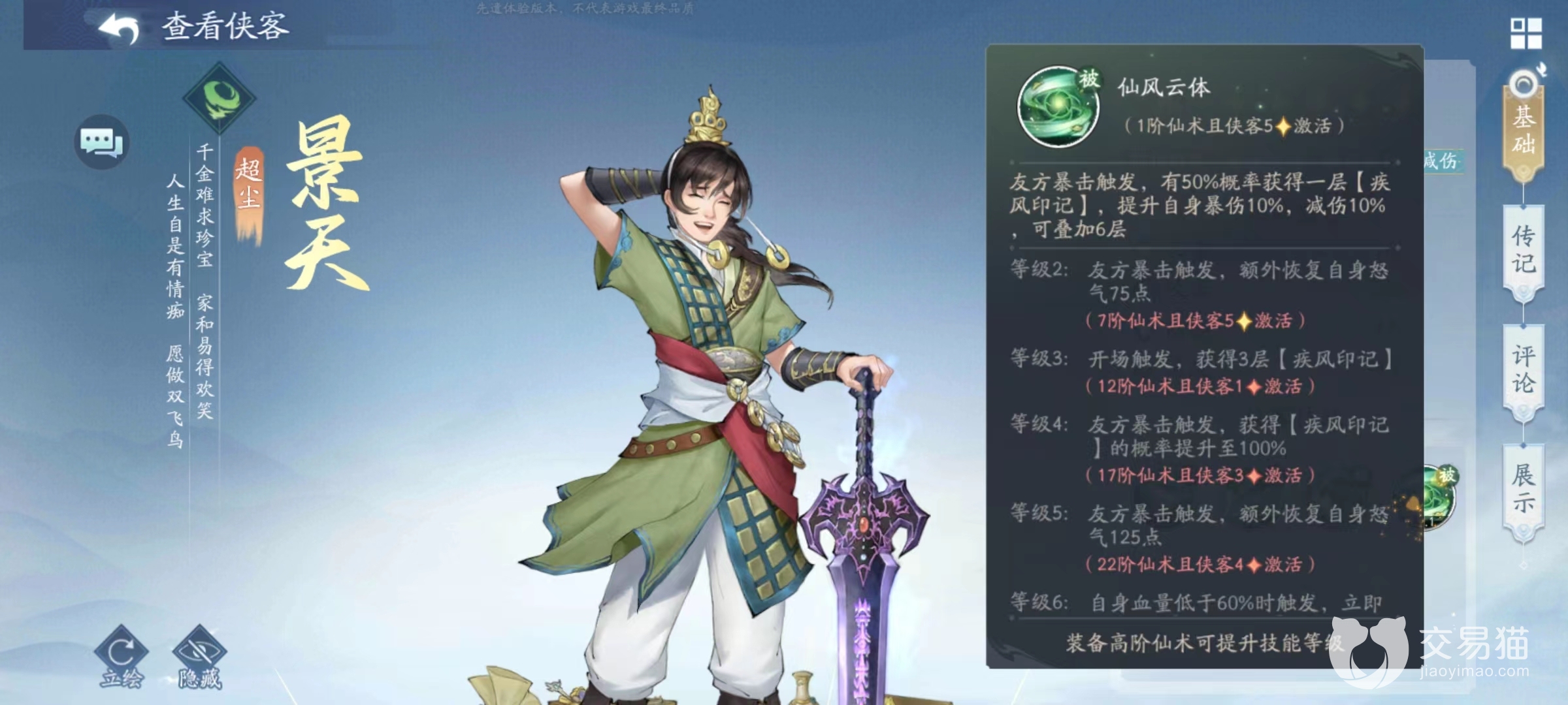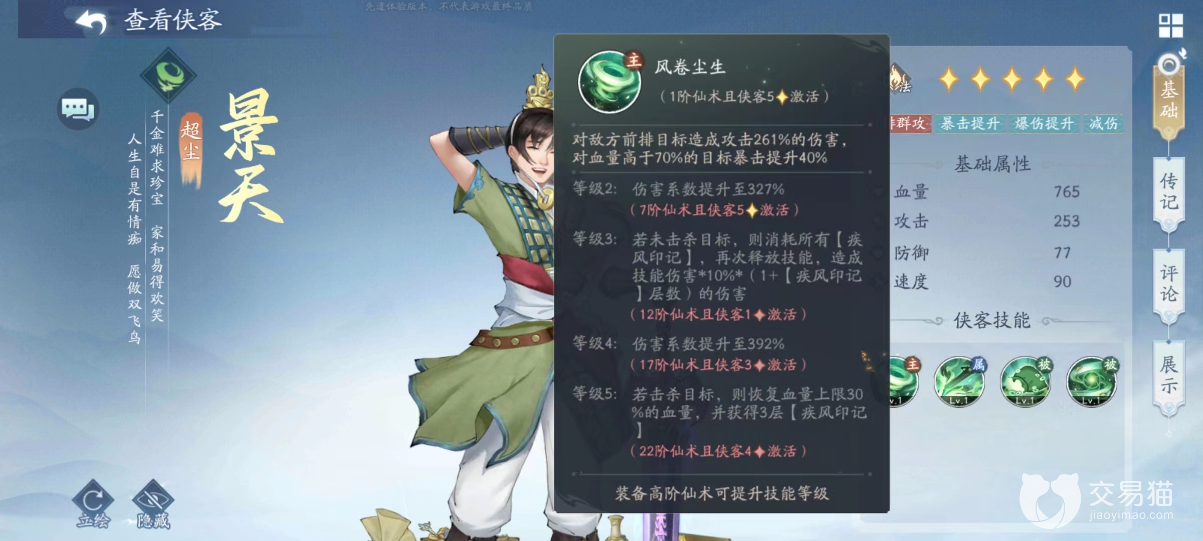 疾风印记是景天自身其他技能所赋予的状态,被动效果仙风云体,每当友方攻击时触发暴击,自身都能获得一层疾风印记。该印记除了用于主动技能触发之外,还可以被动提高自身爆伤和减伤状态,最多叠加到6层。通过升级该技能还将获得额外怒气回复,开场直接获得三层印记,以及血量过低时直接添加印记等。所以这项被动才是景天核心所在,当叠加起来之后将会有非常恐怖的暴击输出能力,而且在减伤方面也有出色的表现,完全能用于前排去吸收伤害。