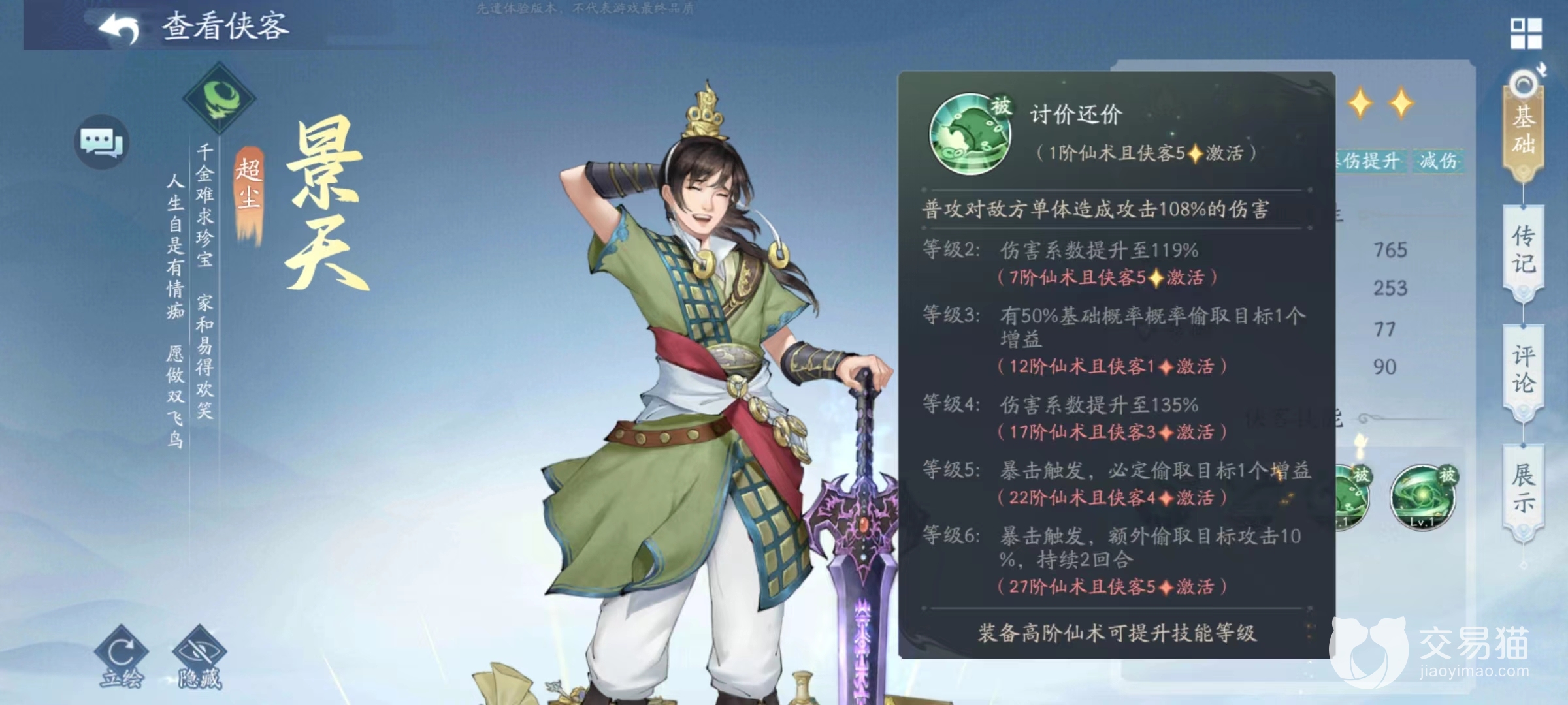 另外一个被动讨价还价,在普攻之后,有几率将目标身上增益状态抽取过来,一旦触发暴击则必定偷取成功,还能额外偷取攻击力。这是非常有趣的一项技能,是景天越战越强的关键所在,很多时候初期景天并不出色,但随着战斗回合延长,不仅被动印记被叠加起来,偷取来的属性也发挥出作用,将会成为后期很关键的人物。