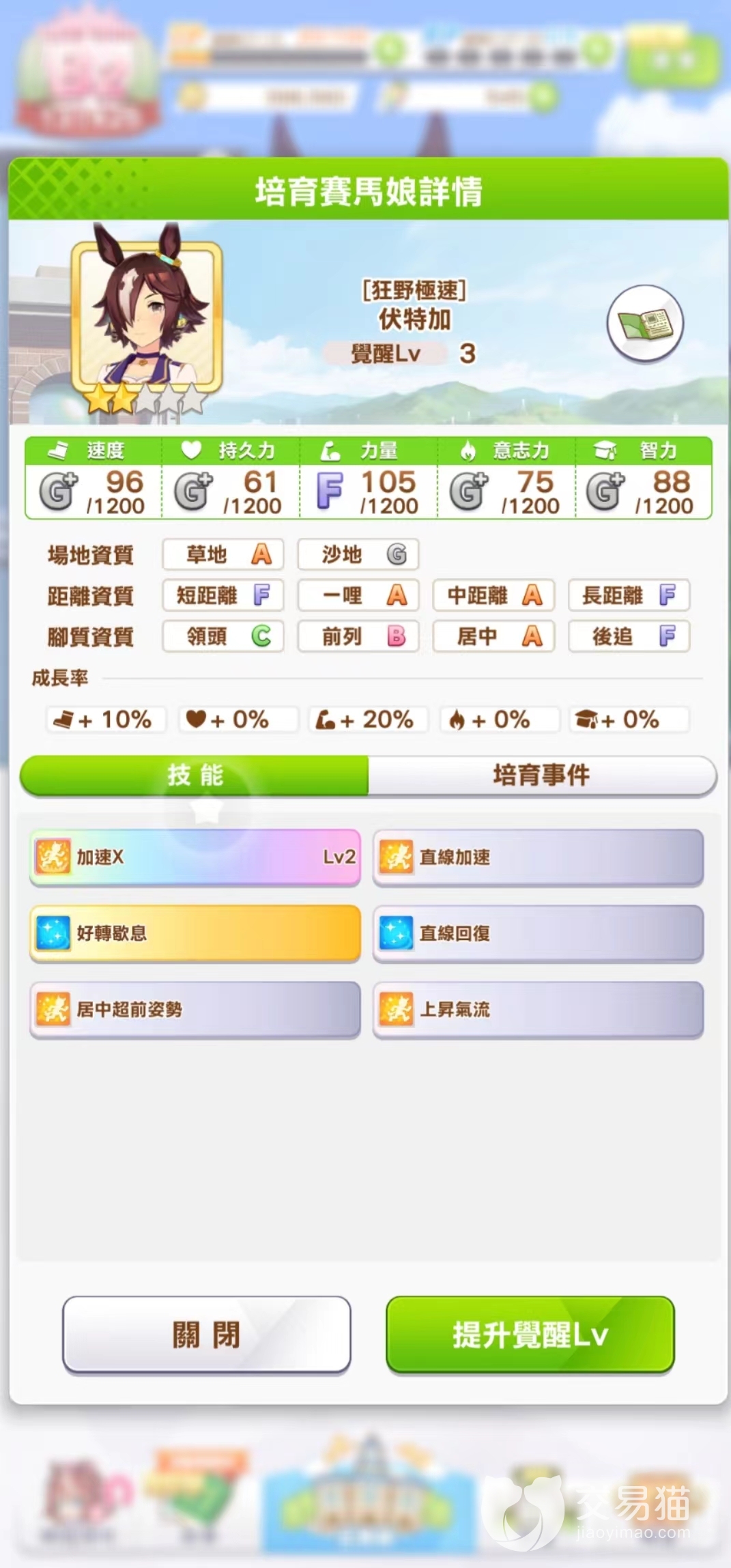 伏特加一哩和中距离的资质都是A,速度和力量都有着不错的成长率,脚质同继承因子先行和居中都能跑,但是更推荐居中,这样固有技能能容易触发。伏特加虽然只是一个二星角色,但她在玩家一哩赛的使用率是比较高的,这也证明了伏特加的实力。