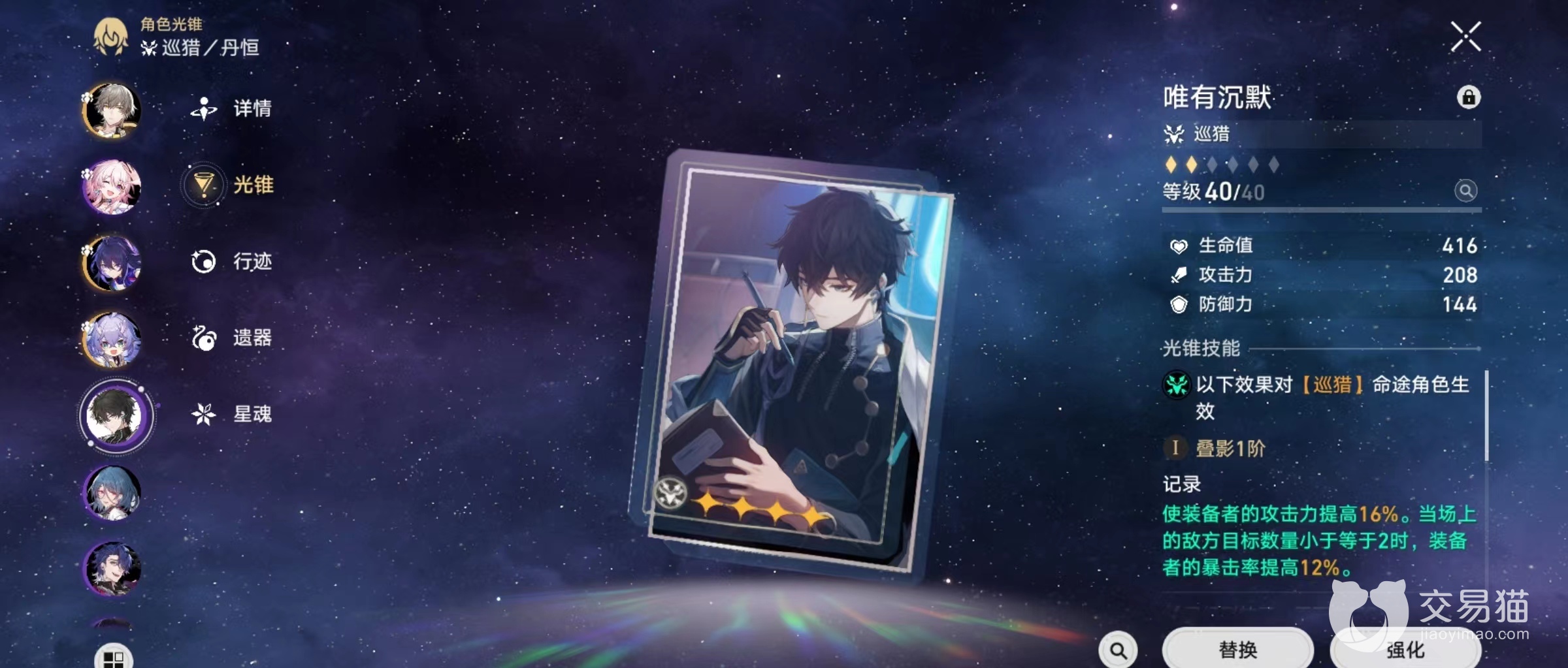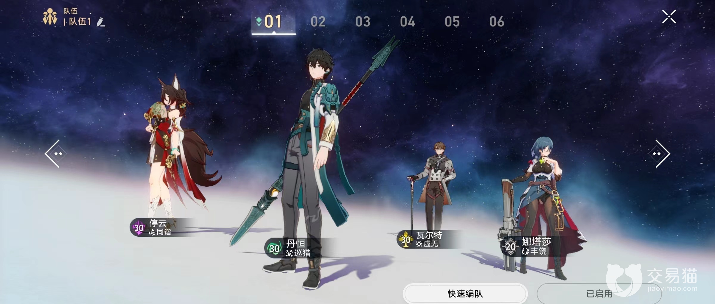 丹恒是风属性的巡猎,所有技能都是单体输出,还带有拉条的功能,整体输出能力足够稳定。前期没有五星的情况下,也可以和四星配队,套盾加控制辅助三月七,治疗辅助娜塔莎,增伤充电宝停云,其中三月七开局送,娜塔莎在主线中可以解锁,停云如果能在卡池中抽到就上,没有的话还可以用艾丝妲作为代替,可以增伤加拉条。