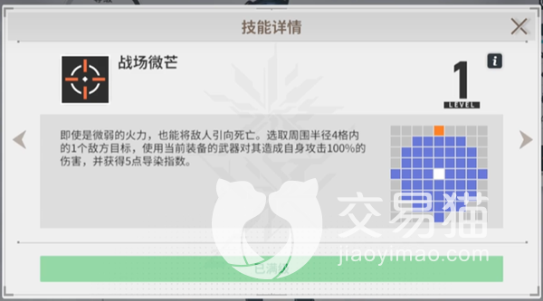 主动技能可以对4格半径范围内的单体敌人造成100%的伤害,值得注意是,释放这个战场微茫技能之后角色可以直接获得5点导染指数。这在游戏中也是比较罕见可以一次性获得这么多点数的技能。