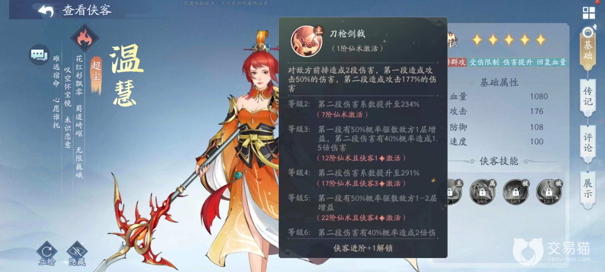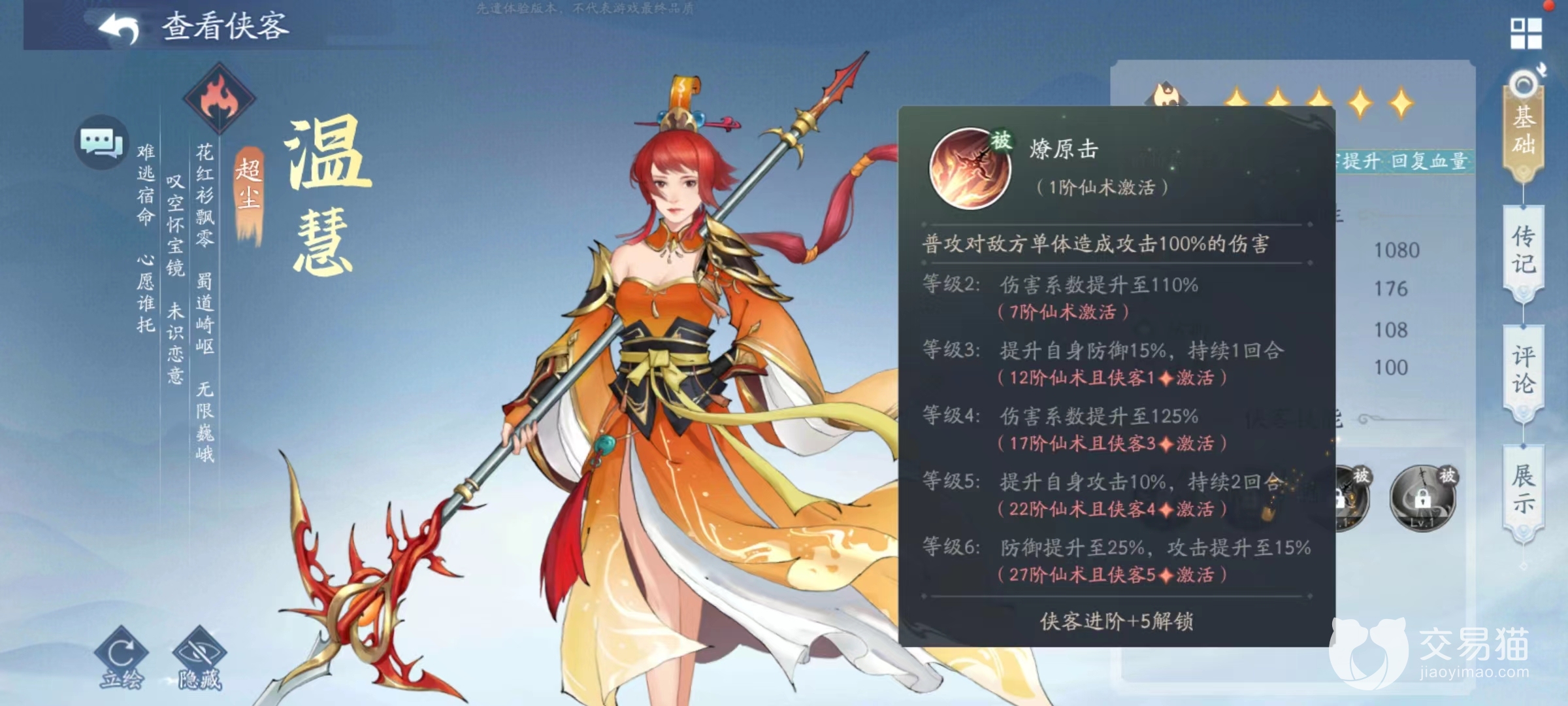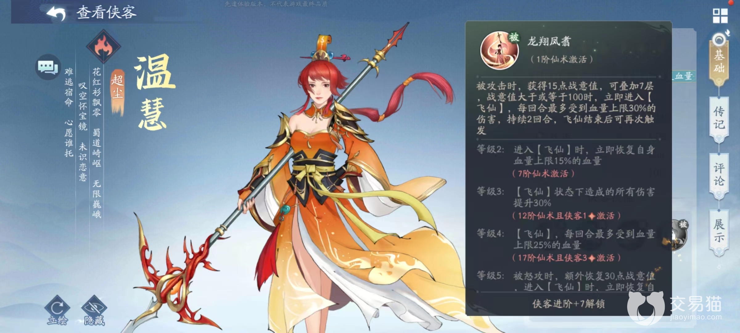 第1个被动在普攻之后提升自身防御以及伤害系数,后续还有提升攻击效果,达到最高级时,防御提升为25%,攻击提升至15%,这已经是非常可观的强化,能够让其站得更久。第2个被动效果是在被攻击时自身获得战意值,战意值属于能叠加效果,当叠加达到100点之后,会立即进入到飞仙状态。在该状态下每回合最多受到30%血量上限伤害,持续两个回合。接下来在提升仙术等级之后,受到的伤害总量会进一步降低,并且使用主动技能时,额外恢复战意。飞仙状态下造成的所有伤害都大幅提升。
