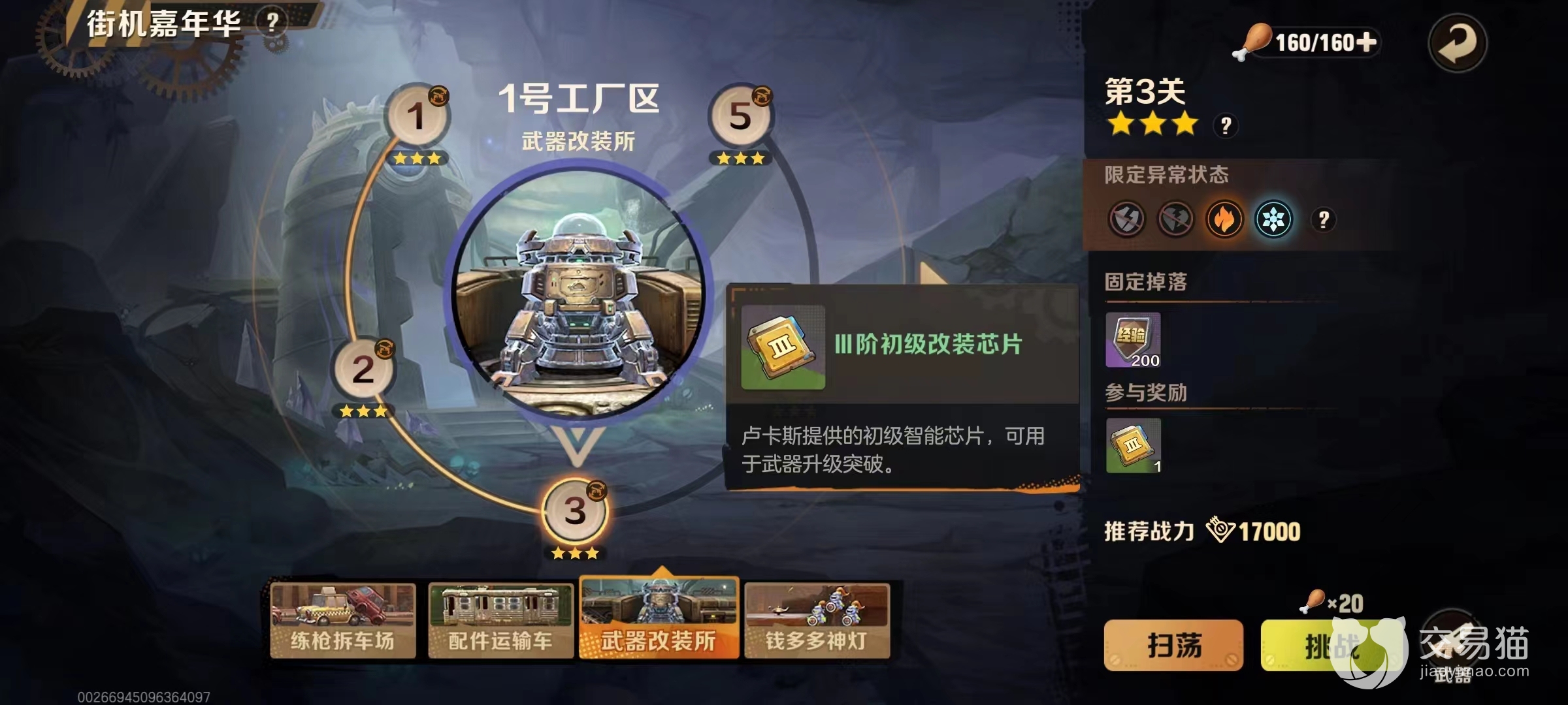 这一关的通关奖励,是固定掉落200点角色经验,以及三阶初级改装芯片,武器前期都需要这个东西来突破等级,所以前期体力足够的情况下,可以多囤一点。