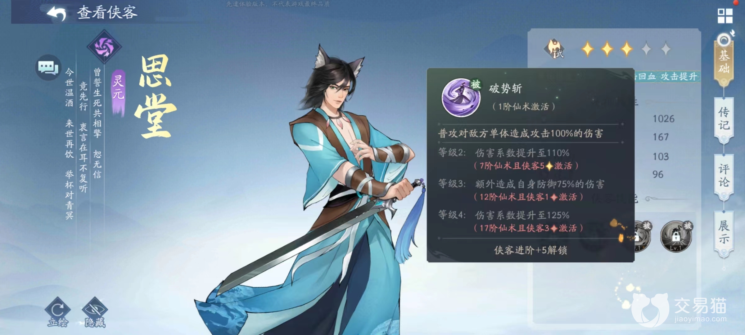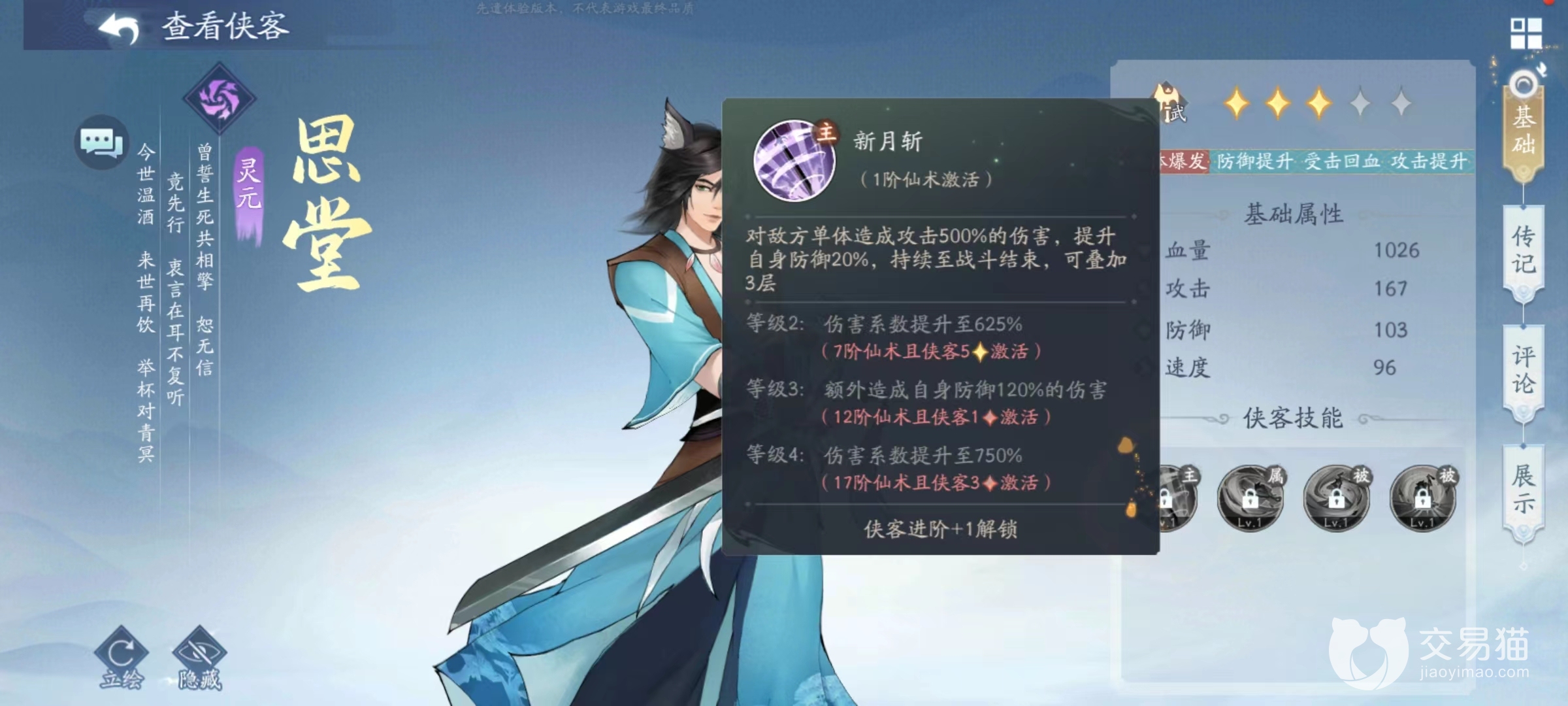 目前思堂只有雷属性这一种,这和其他有多种不同形象的角色来说,确实有些单薄,而且初始只有三星,这样带来劣势是发展潜力较低,优势在于可以快速达到上限。主动技能新月斩,伤害对方单体造成高额伤害的同时,自身获得防御提升,可以持续至战斗结束,防御提升效果最多叠加到三层。第1个被动破势斩,提升普攻伤害系数,还能附加额外伤害,额外伤害的数值与自身防御相关。