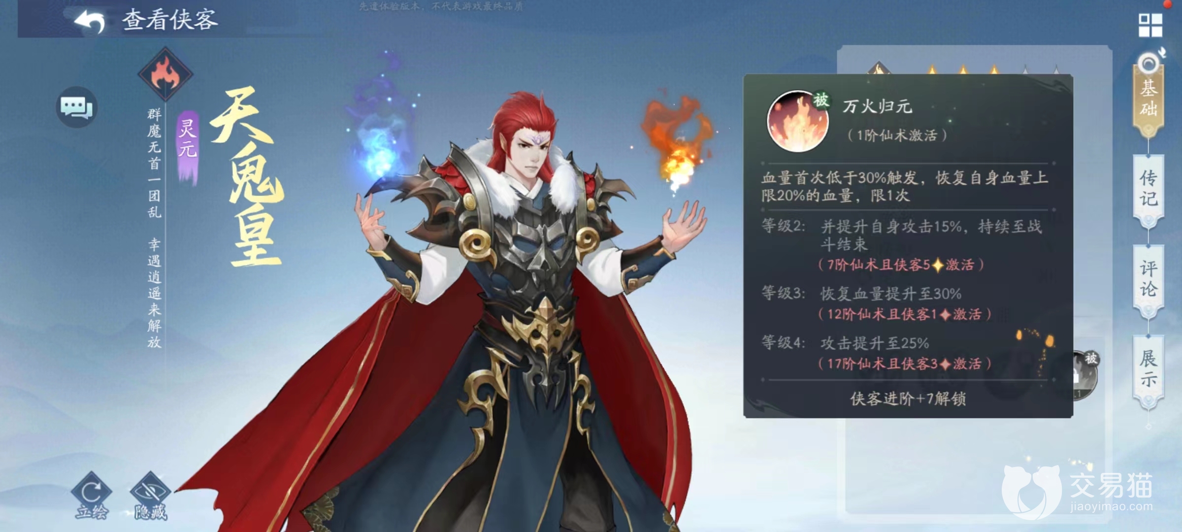 而且在实战中小编明显感受到该角色太过脆弱,在面对很多强度较高战斗时,经常会直接阵亡,虽然有被动加持,依然改善不了这一局面。主动技能在前期推图很有帮助,如果想走前期群体输出路线,那么天鬼皇完全可以入手,但是后期记得一定要更换下来。火属性中很多角色都比较出色,例如温慧、南宫煌等,后期将培养好的天鬼皇当做材料也是可以的。