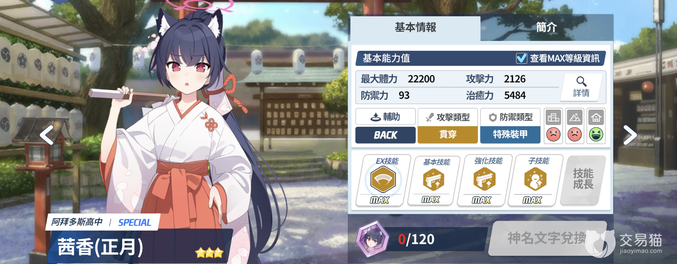 茜香(正月)作为一名初始三星SPECIAL角色,与普通形态茜香的攻击类型不同,茜香(正月)不仅不会出现在战场上,同时也不会进行普通攻击,只依靠技能对地方造成伤害。茜香(正月)的定位是辅助,输出类型为贯穿属性,防御类型为特殊装甲,但由于SPECIAL角色不会受到伤害的设定,所以面板中的防御力与回避数值并不重要。