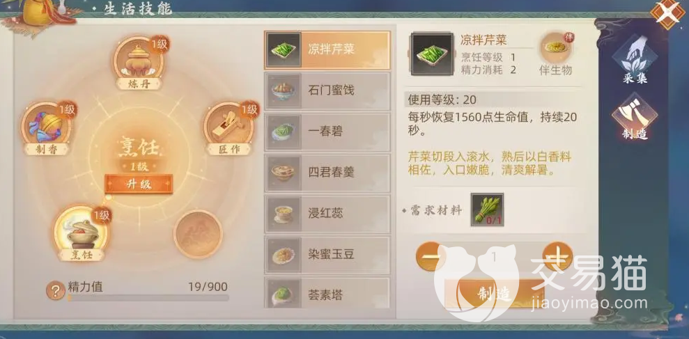其次就是烹饪,作为一个高人气的生活技能,玩家能在游戏里面去烹饪各类美食,并且能通过它来提高角色的饱食度和生命值,此外在人物的属性强化方面做的也是非常的不错,同时通过烹饪玩家也是能获取到一定收益的,把美食出售给其他的玩家,那么就能得到金币的报酬。