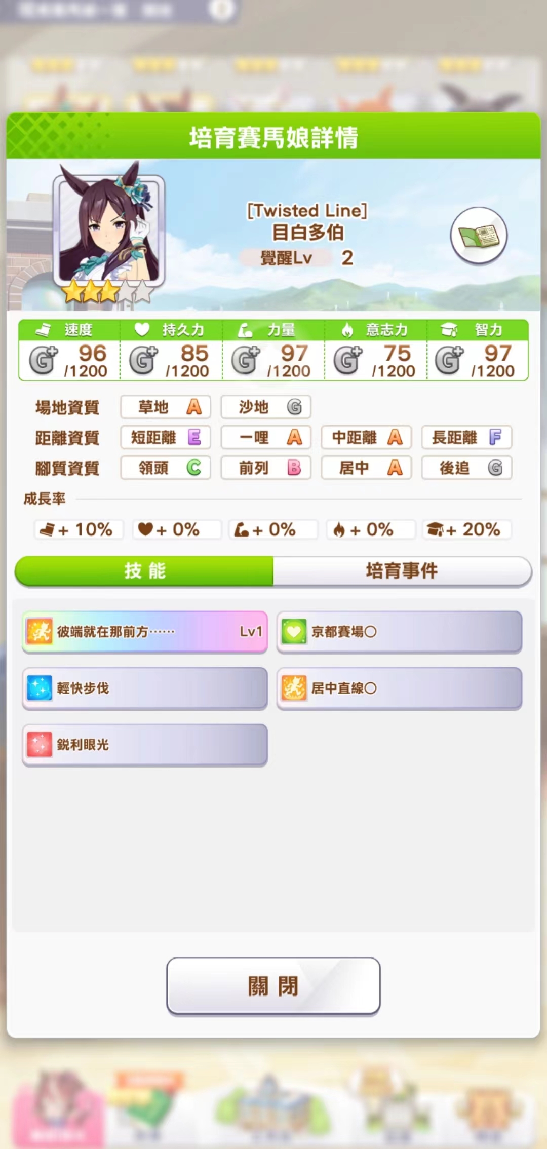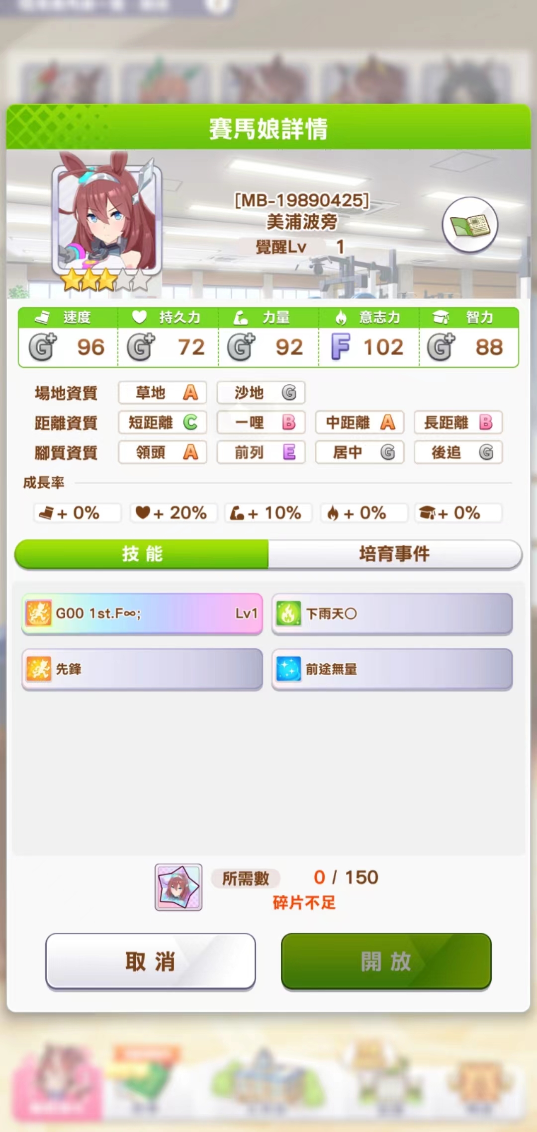 美浦波旁仅有中距离资质为A,最好通过继承因子将一哩和长距离的资质也升到A,因为她的培育目标有好几次G1的一哩和长距离比赛,都是有名次要求的。美浦波旁都是跑领头的位置,所以对持久力的要求很高,不过她自身有20%的持久力成长率,所以持久力不是难点,难点是速度,领头是要很高的速度才能不被别的赛马娘追上,所以她是一个很难培育好的角色,不过培育成功的话会非常强势。