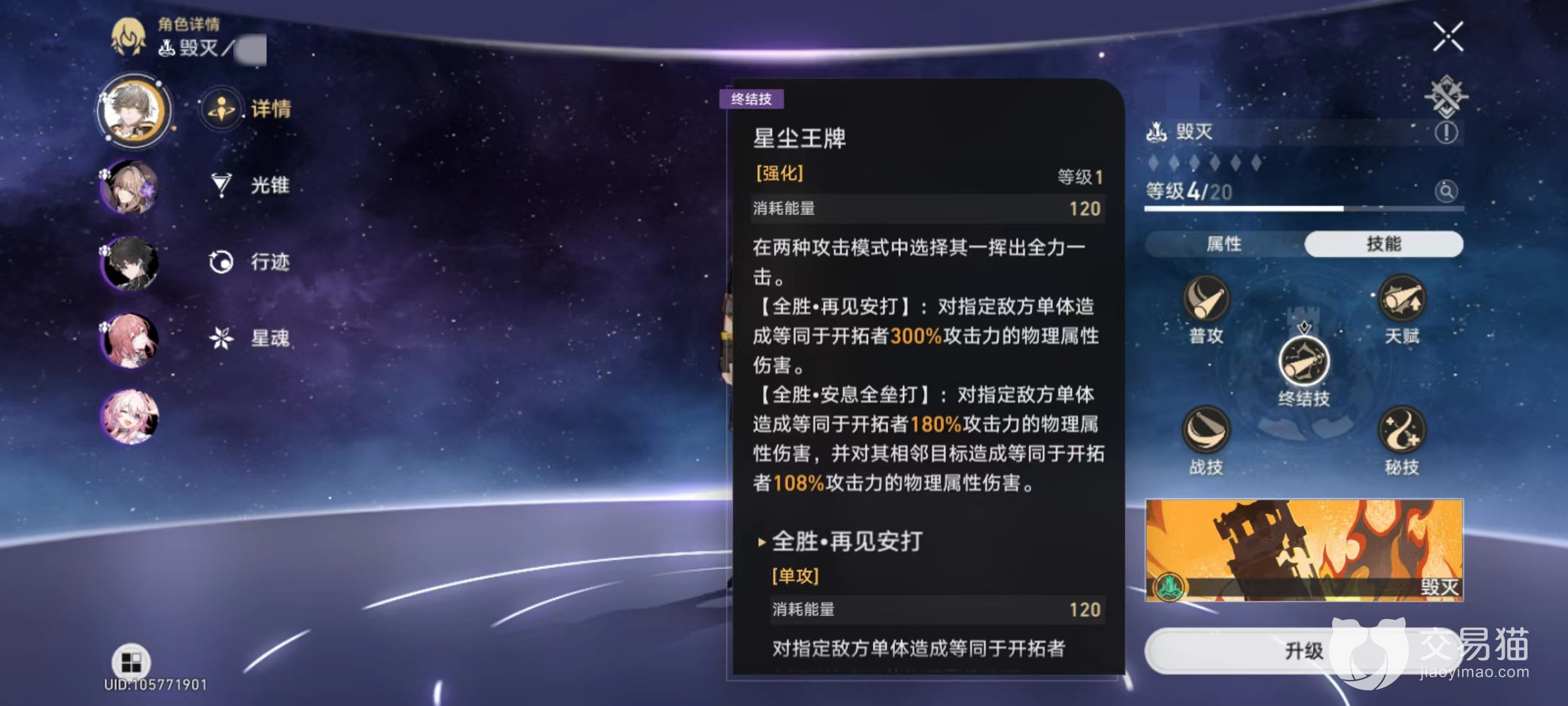 主角虽然被很多玩家所遗弃,但是其实自身的技能并不算太差,天赋可以在每次击破弱点后获得攻击力提升状态,最多叠加到两层。战技则是范围伤害,除了伤害敌方单体目标之外,还能对相邻两个单位造成少量物理属性伤害,虽然比主要输出目标略低,但是用于清理小怪完全够用。终结技是在两种攻击模式中任选其一,分别是再见安打和安息全垒打,同样是单体伤害,但一个是纯单体,一个则是相邻目标扩散。