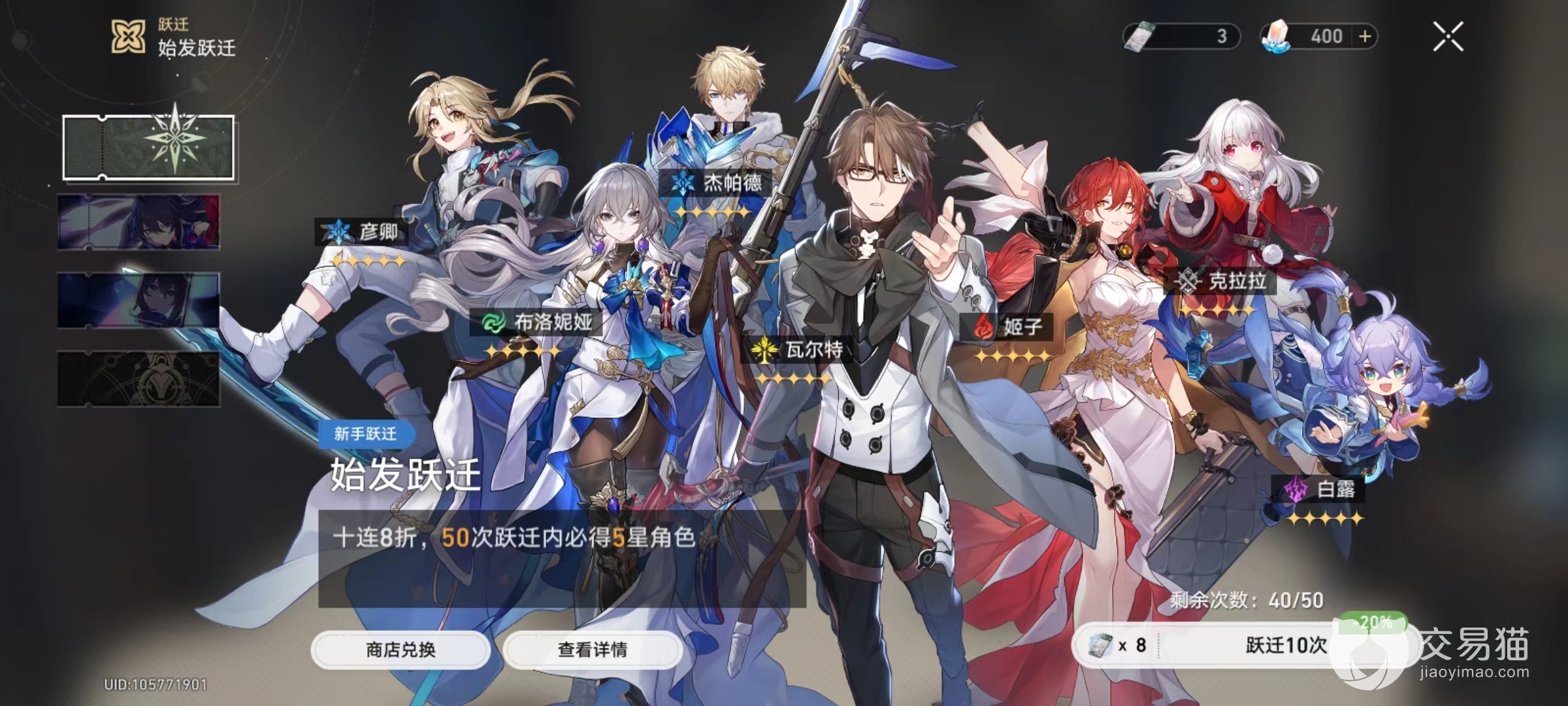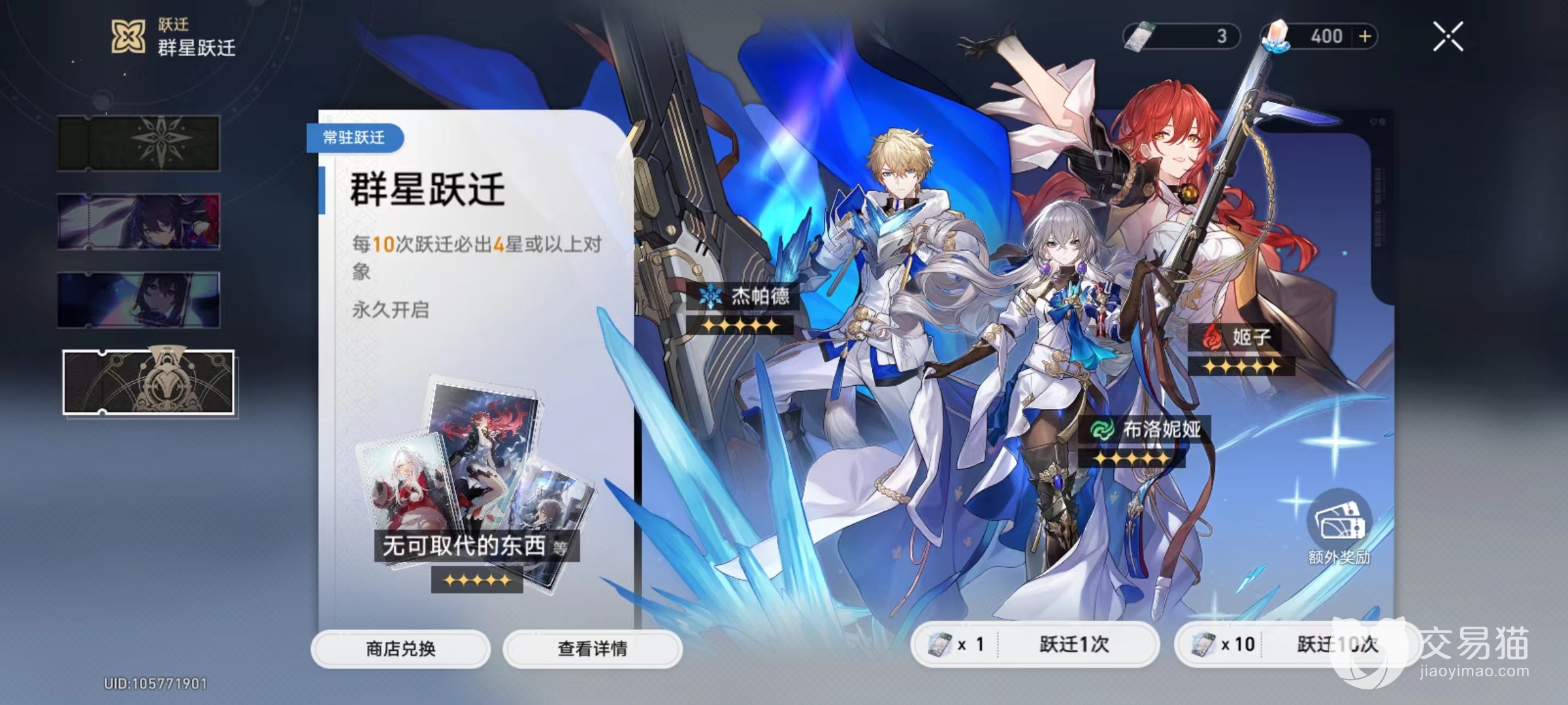 最后的群星跃迁就是常驻池,里面出现任何角色的几率都有,目前较高几率的是杰帕德,布洛妮娅和姬子,还有她们相对的光锥。等到始发跃迁抽取结束并且顺利获得希儿之后,接下来带抽取的就是这里的群星跃迁。