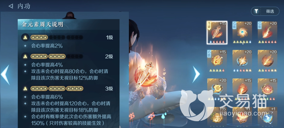 而内功周天的属性分为许多种,比如金元素,那么主要就是针对玩家的会心值进行提高,同时在攻击的时候也能够有机会无视目标的防御,不过也是需要提升到一定的等级,基础属性只有会心值的增加。