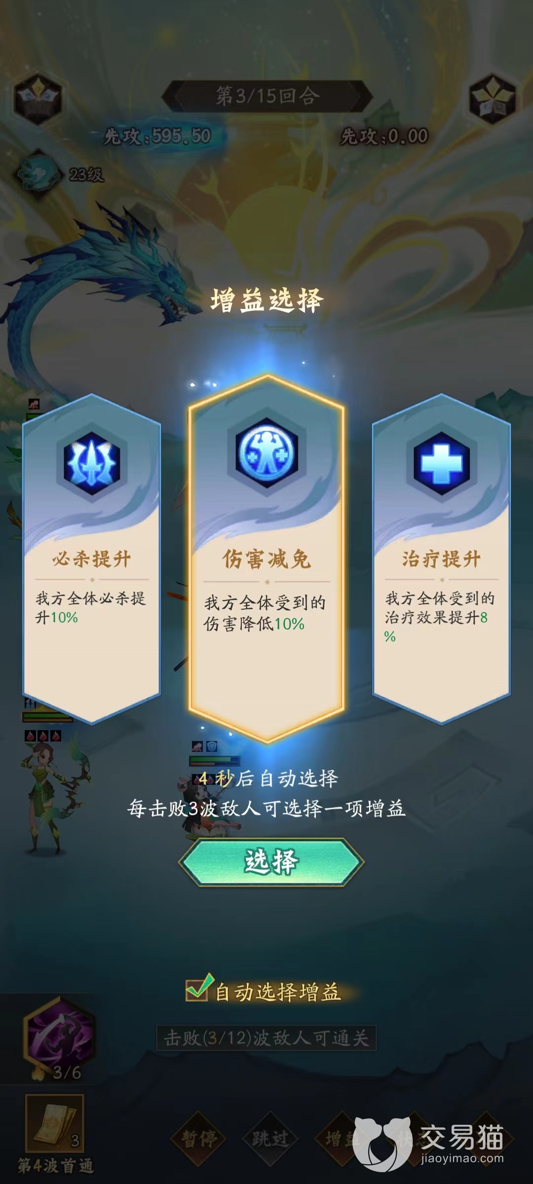 小伙伴们在选择了阵容之后,就能够进入到连续12轮的战斗之中,每三轮战斗就可以选择一个比较不错的buff,这样能够相对来说增强一些队伍的战力,一般来说想要通过后续的关卡,选择一些增强防御的buff是非常不错的,能够很好的提高队伍的坦度,队伍中再搭配上一个奶妈的话,就能够极大的增加队伍的胜率。