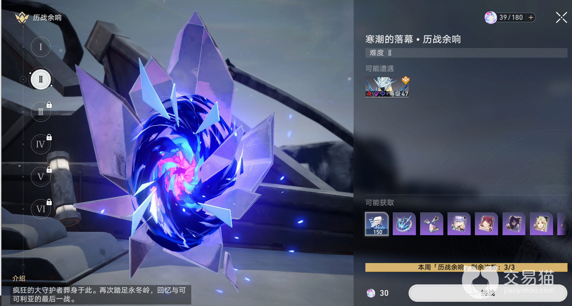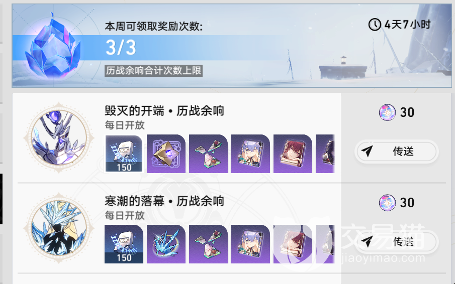 2.历战余响,称之为周本,一周可挑战三次不会累积,目前只开设了2个周本,毁灭的开端、寒潮的落幕,如果不是强度碾压的话,必须带弱点角色出战,不然很容易翻车,好在可以好友支援上阵。