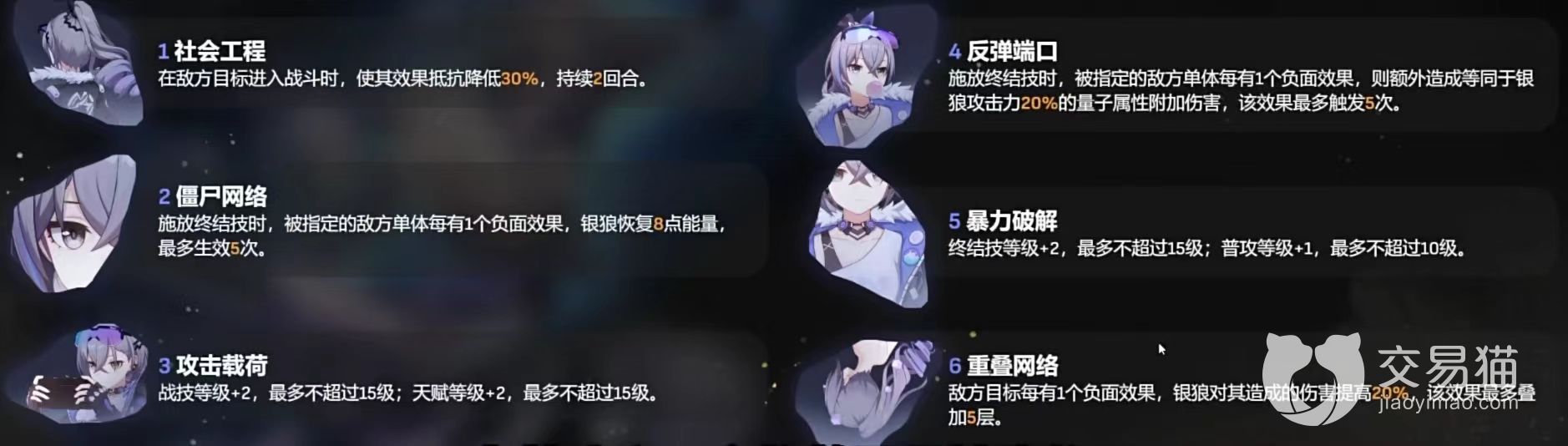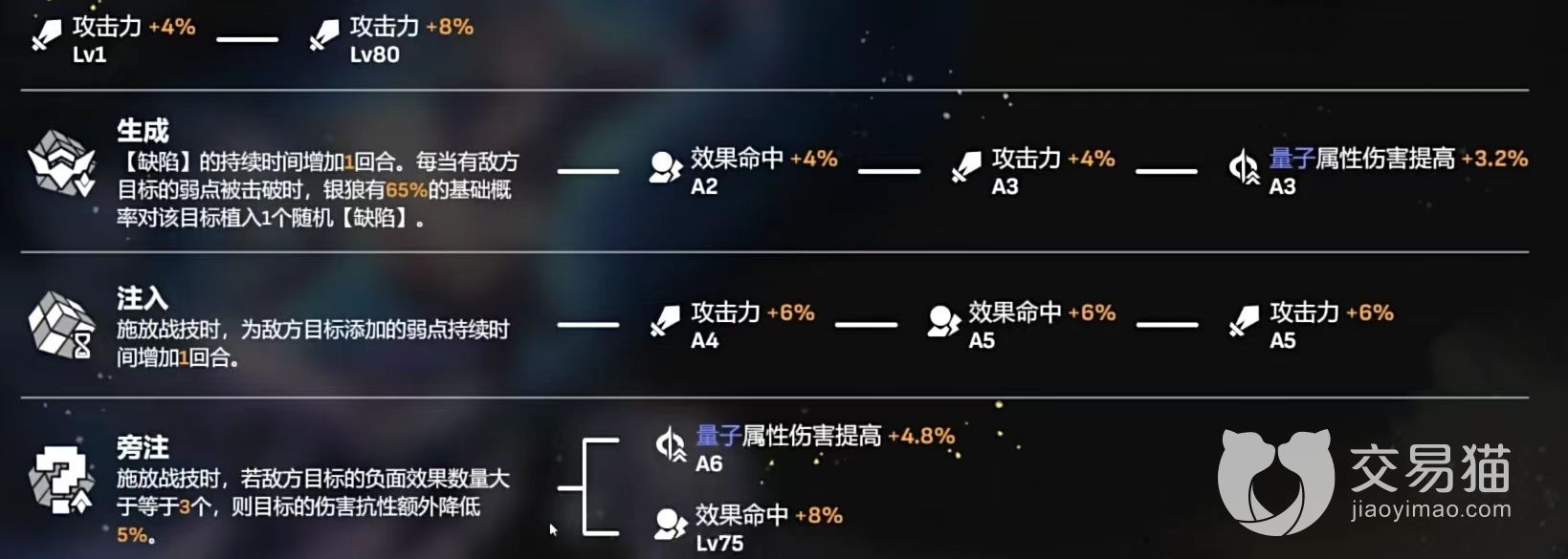 4.终结技:有85%的概率让受到攻击的敌方目标降低40%防御力,并造成高额单体量子伤害。