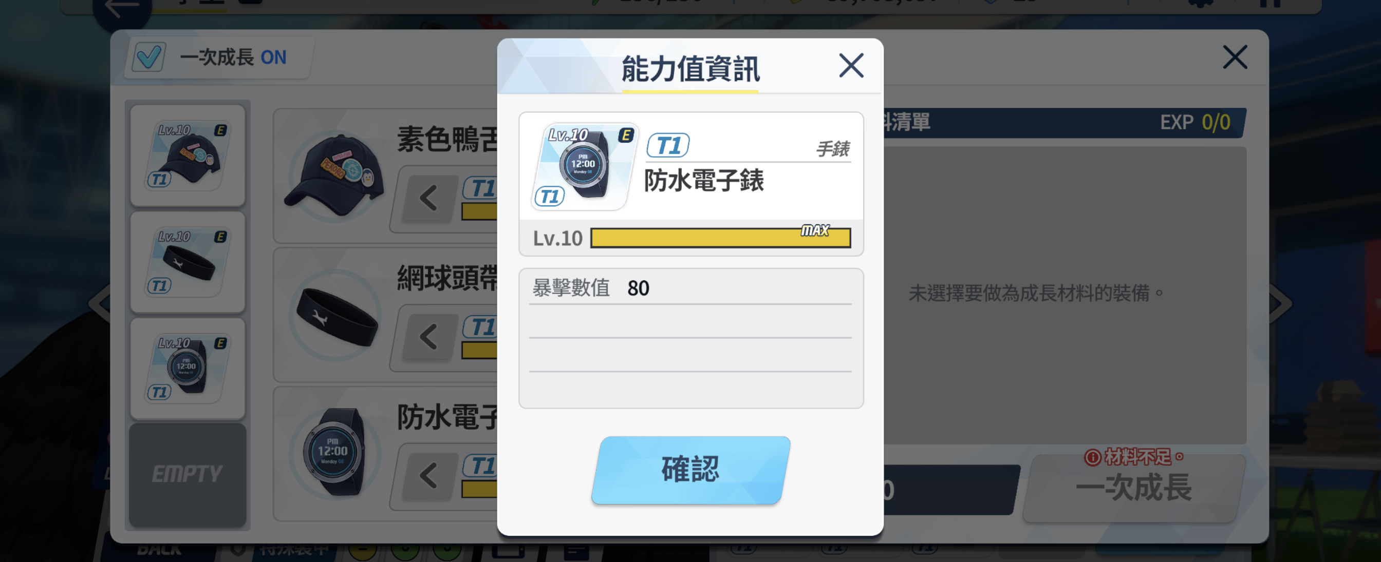 手表是游戏中最常见的特殊装备,在T7阶段为学生们带来320的暴击值、1800暴击伤害以及7%的最大体力提升,属于输出角色经常配备的特殊装备,也是需求量最大的一个,基本上对于输出角色来说,优先级和攻击装备在同一阶段。